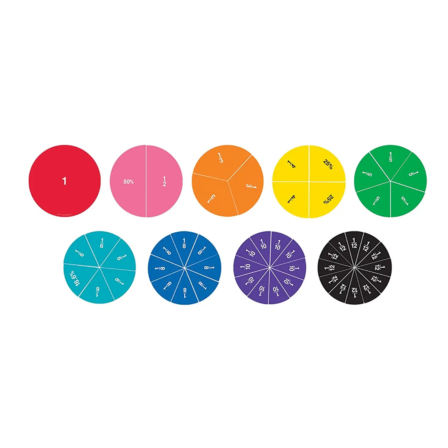 Valido sussidio per dimostrare e aiutare a capire le relazioni fra frazioni, precentuali ed equivalenze sulla lavagna ed introdurre il relativo sistema di calcolo. Ogni cerchio è scomposto in fette - bifacciali - sulle quali è impresso il suo valore sottoforma di frazione su un lato e il corrispondente valore equivalente espresso in percentuale sul retro (es. 1=100% 1⁄2=50% e così via). Tutto in materiale pastico magnetico.