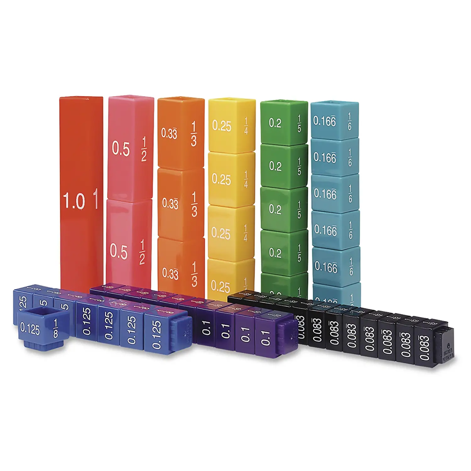 - ✅ Set didattico per visualizzare quantità equivalenti in frazioni, decimali e percentuali, espresso con colori e valori sui cubetti.