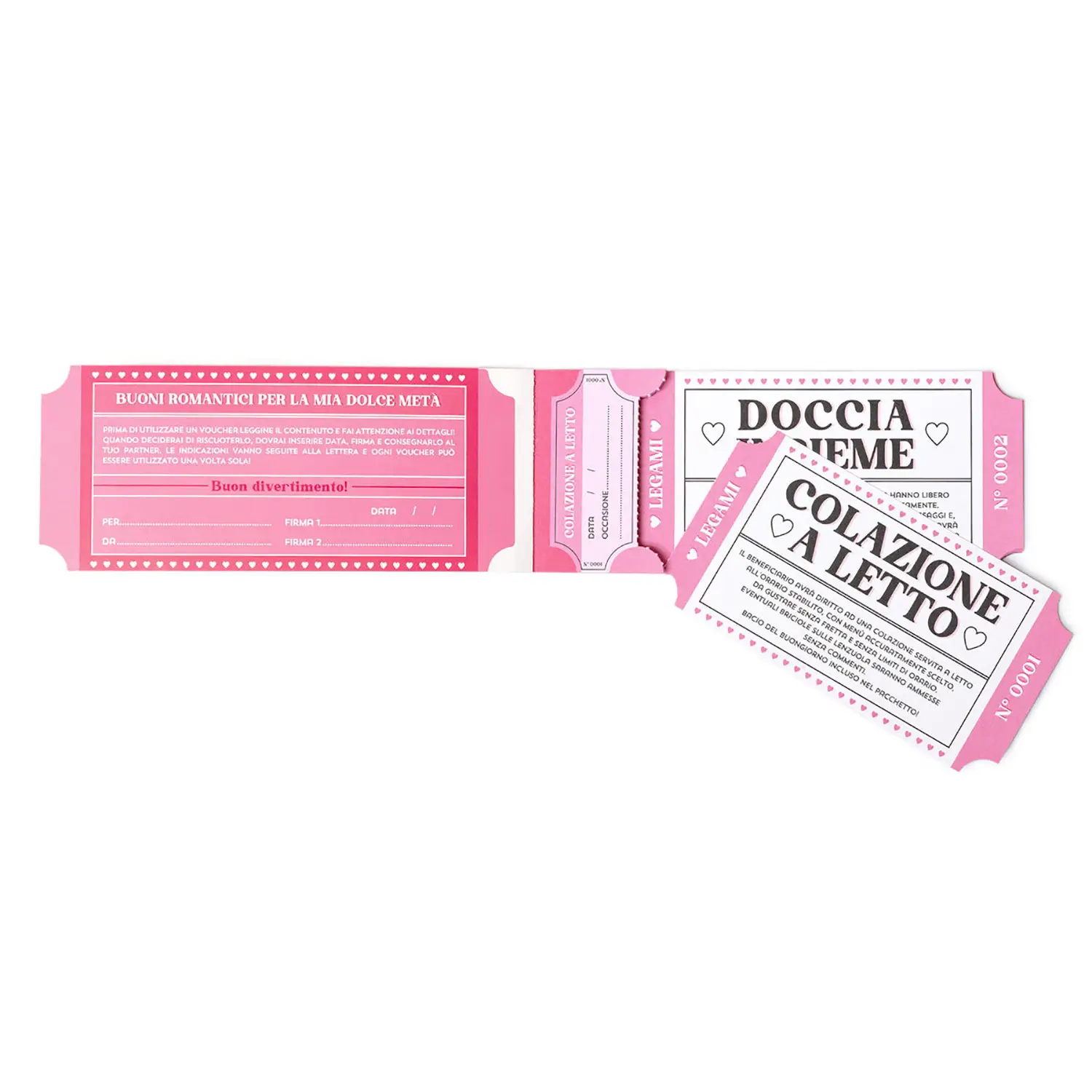 24 voucher da regalare e riscuotere – Il blocchetto contiene 24 buoni romantici che il partner potrà utilizzare quando desidera, scegliendo tra esperienze, gesti d’amore e momenti di condivisione.