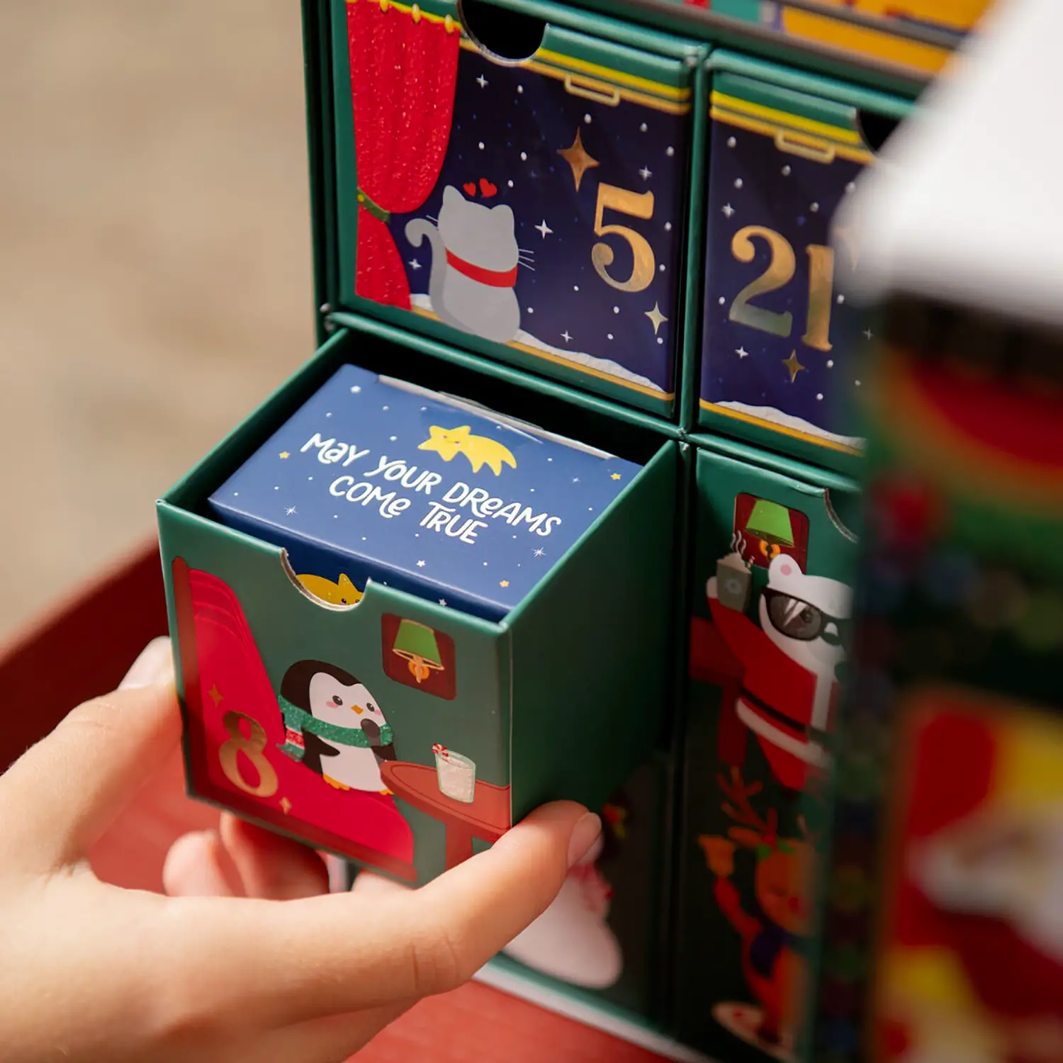 Design elegante e natalizio: Con dettagli in lamina e glitter, il calendario aggiunge un tocco luminoso e raffinato all’ambiente, diventando anche una splendida decorazione per la casa o la scrivania.