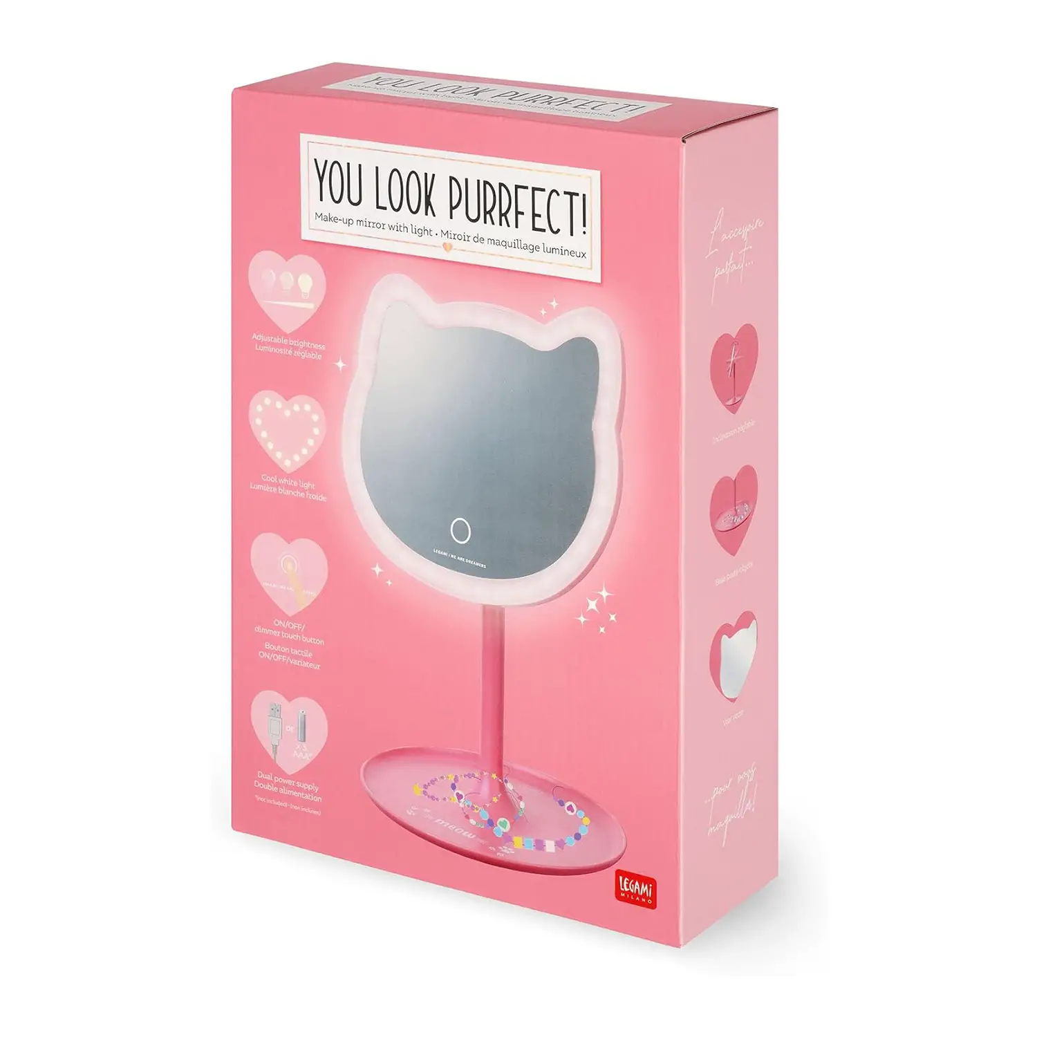 Un Design Accattivante e Funzionale Il Legami - Specchio da Trucco con Luce - You Look Purrfect! offre un design elegante con illuminazione regolabile, ideale per il trucco perfetto. La base portaoggetti è pratica per gioielli e trucchi. Illuminazione LED Regolabile Dotato di 33 LED bianchi, questo specchio da trucco garantisce un’illuminazione ottimale. Il pulsante touch ON/OFF/dimmer permette di regolare facilmente la luce per risultati impeccabili. Doppia Alimentazione Versatile Lo specchio offre doppia alimentazione: funziona sia con 3 batterie AAA (non incluse) che tramite cavo USB (incluso), garantendo massima flessibilità d’uso ovunque. Qualità e Innovazione Legami Legami crea oggetti di qualità, colorati e divertenti. Lo specchio
