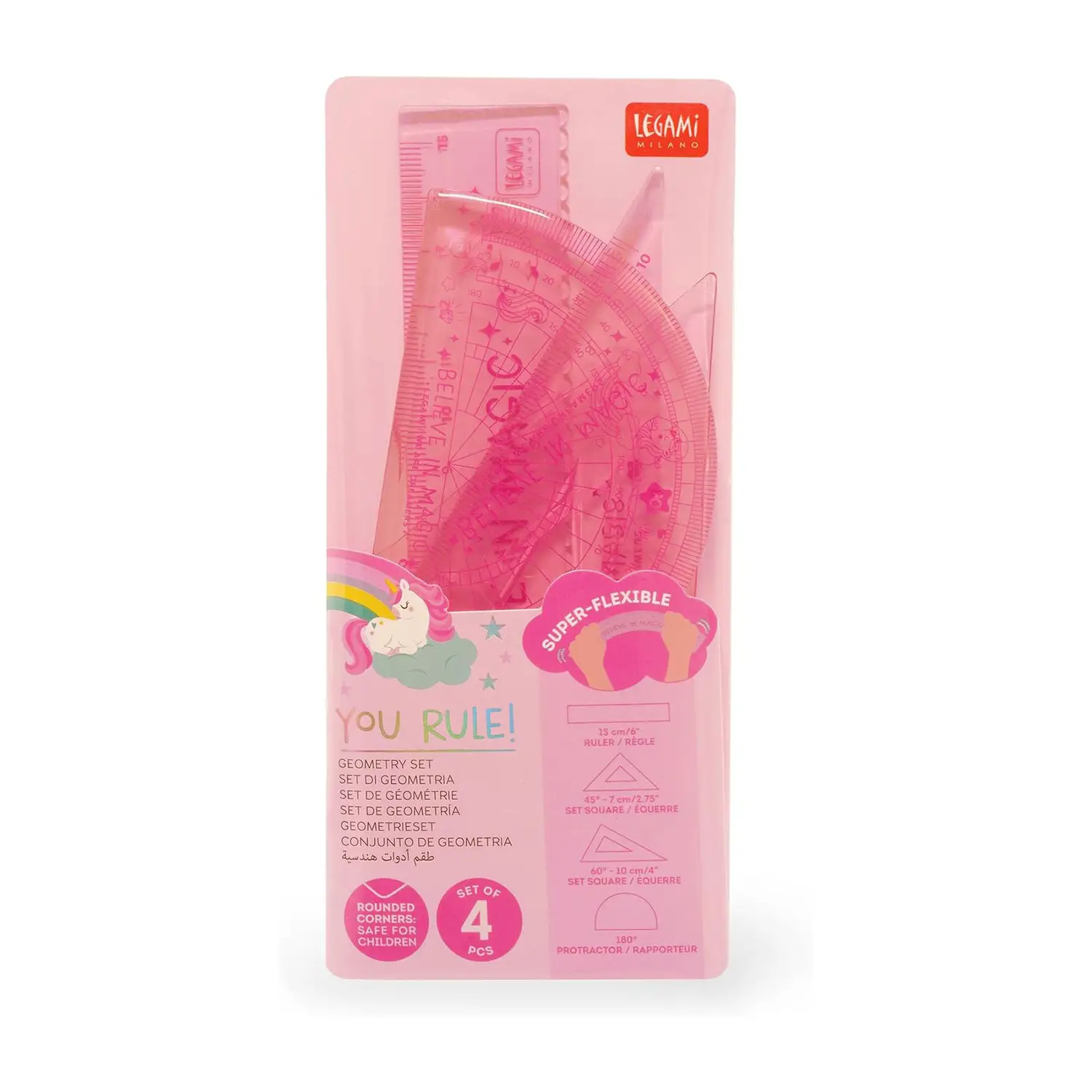 Set Righello e Squadra Unicorn Il Set Righello da 15 cm, Squadra 60° da 10 cm, Goniometro 180°- Unicorn di LEGAMI è perfetto per scuola e lavoro. Materiale Flessibile e Resistente Realizzato in PVC flessibile, questo set geometrico offre resistenza e adattabilità in ogni situazione. Kit Completo con Custodia Include righello, squadra 60°, squadra 45° e goniometro 180°, con custodia per un trasporto facile. Design Divertente e Positivo Il design Unicorn aggiunge un tocco di colore e allegria, rendendo il lavoro più piacevole.