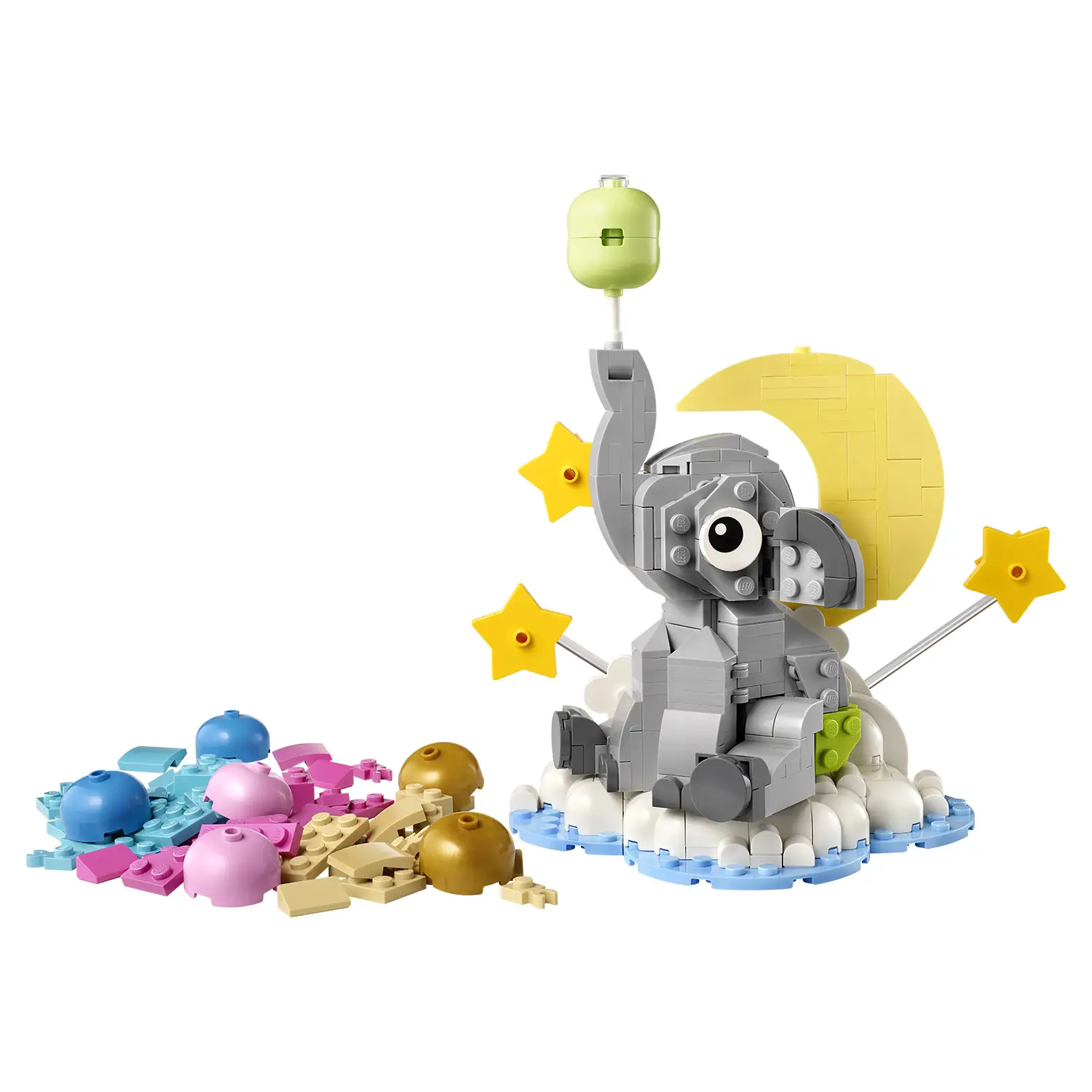 Elefantino costruibile con dettagli realistici Il modello raffigura un elefantino seduto su una nuvola, con testa girevole e dettagli curati. Le decorazioni con luna e stelle creano un’atmosfera dolce e rilassante.