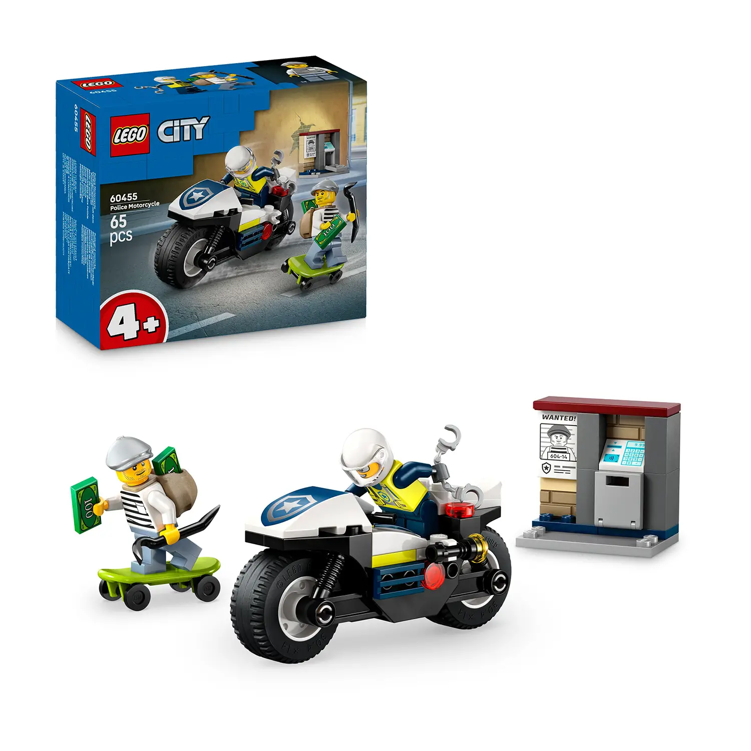 Set d’azione con moto LEGO per inseguimenti emozionanti Questo set LEGO City 60455 è perfetto per introdurre i più piccoli al gioco di ruolo. Include una motocicletta della polizia, uno skateboard per la fuga e un mini bancomat apribile. I bambini possono immaginare inseguimenti spericolati e scene realistiche grazie ai dettagli curati e alle due minifigure incluse.