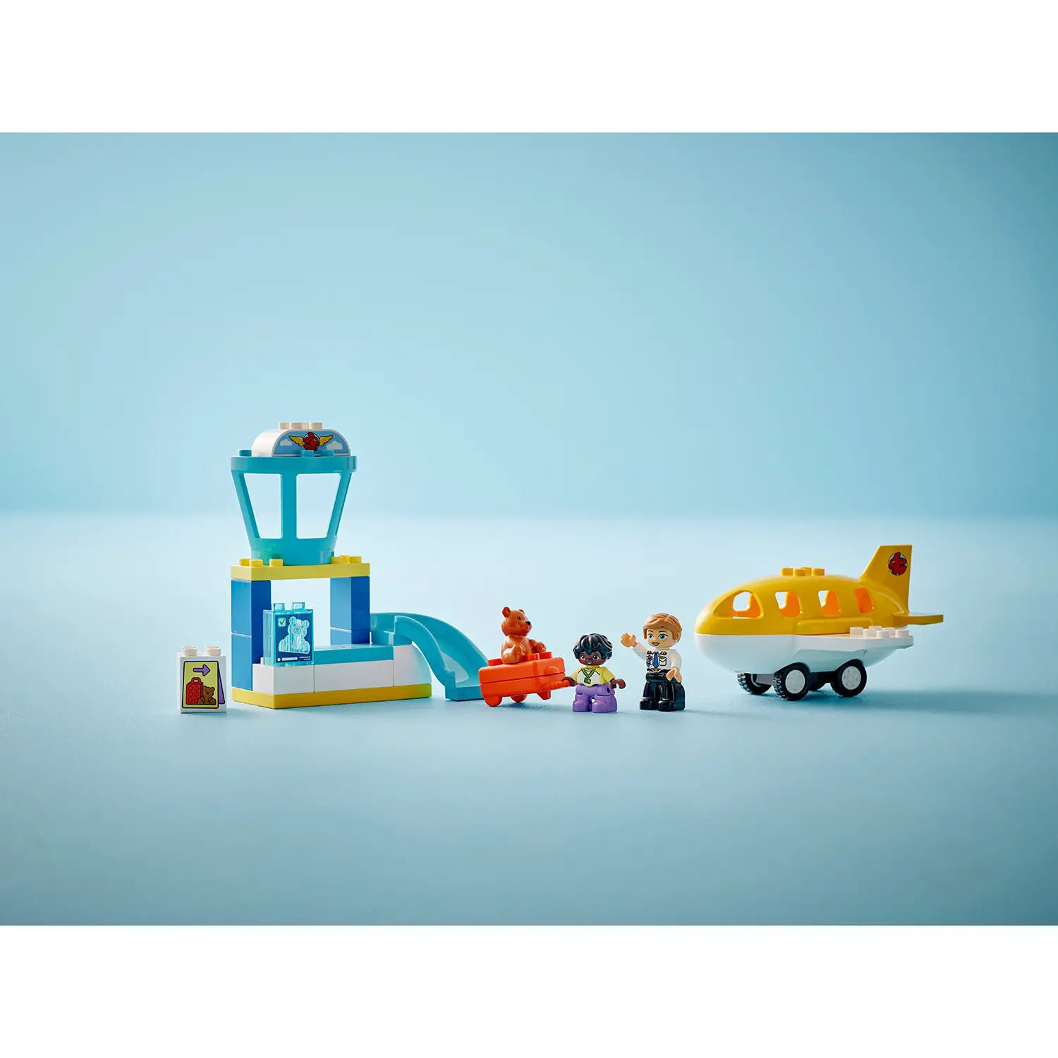 Personaggi e accessori inclusi Il set comprende il pilota, un bambino, un orsacchiotto LEGO e tanti accessori: valigia apribile, scanner bagagli e scivolo. Ogni elemento supporta il gioco di ruolo educativo.
