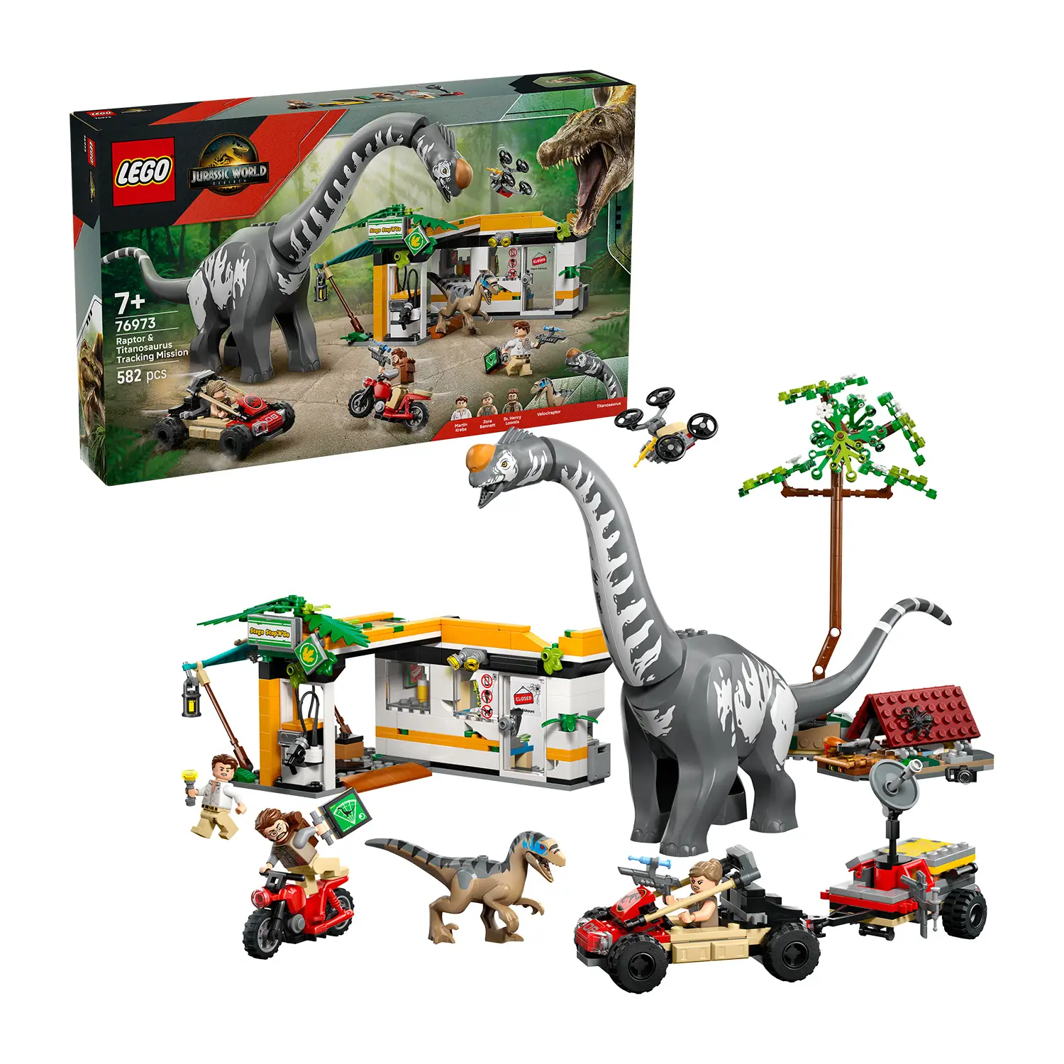Personaggi e dinosauri iconici inclusi nel set Il set contiene Titanosauro e Velociraptor LEGO con parti mobili, oltre a tre minifigure: Zora Bennett, Martin Krebs e il Dr. Henry Loomis, per ispirare avventure realistiche.