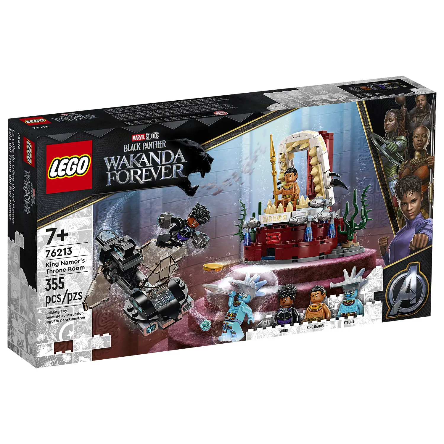 Il set include 3 minifigure di Shuri, Attuma e Re Namor, insieme a fantastiche armi e accessori per rendere le avventure ancora più coinvolgenti.