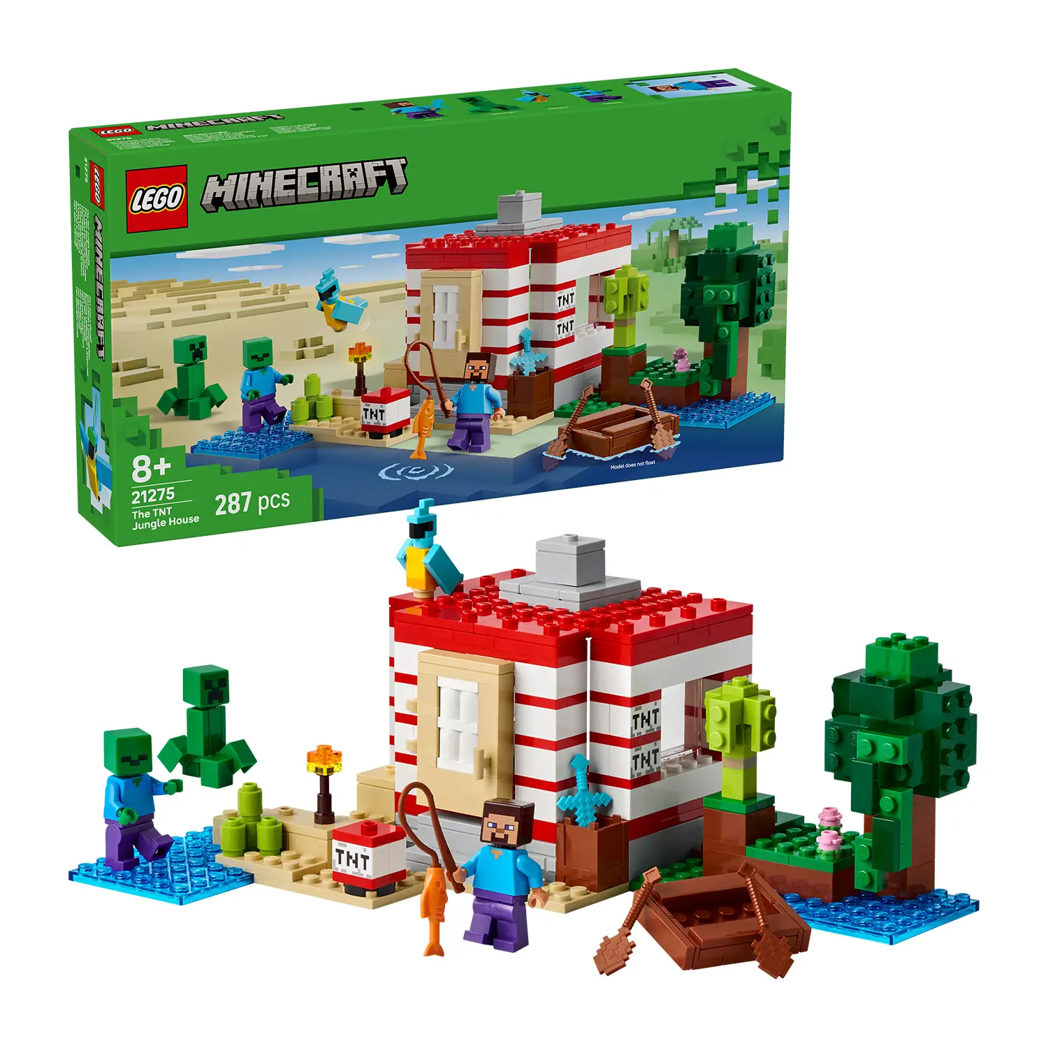 Casa Minecraft con funzione di esplosione TNT Il set LEGO Minecraft 21275 è ambientato nel bioma della giungla e riproduce una casa costruibile a forma di dinamite, dotata di un interruttore che attiva una vera funzione di esplosione per far crollare tetto e pareti.