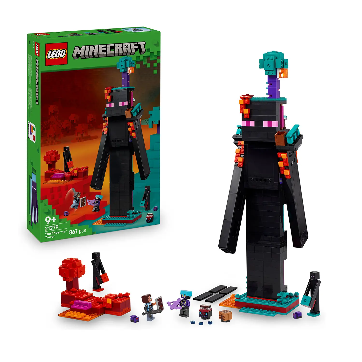 Set Minecraft 2in1 con Torre dell’Enderman modulare Il set LEGO Minecraft 21279 permette di costruire una maestosa torre snodabile a forma di Enderman con portale del Nether, oppure trasformarla in due fortezze PvP colorate per battaglie a tema videogioco.