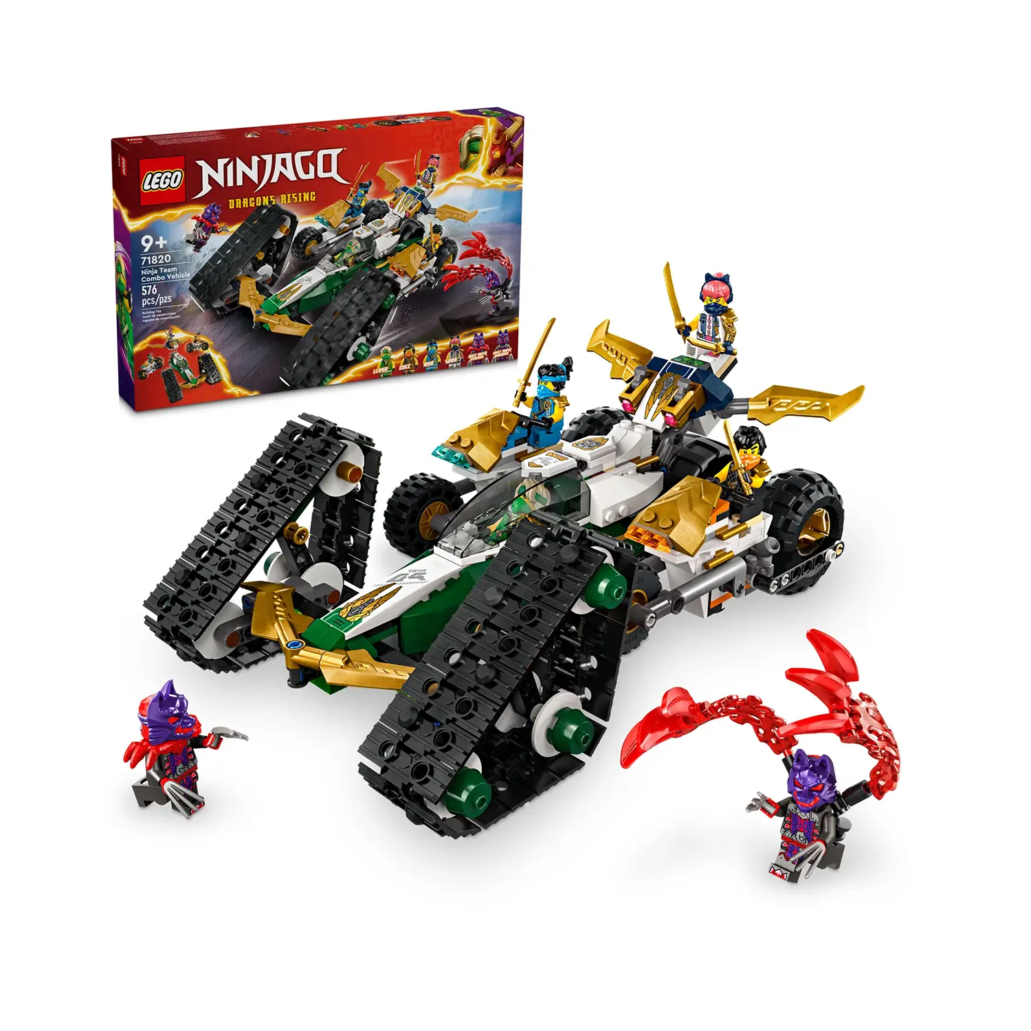Set LEGO® NINJAGO® - Cingolato del Team Ninja per avventure dinamiche: Questo giocattolo d’avventura 4 in 1 è perfetto per i bambini dai 9 anni in su, offrendo un veicolo grande che si trasforma in quattro veicoli più piccoli per scene d’azione intense.