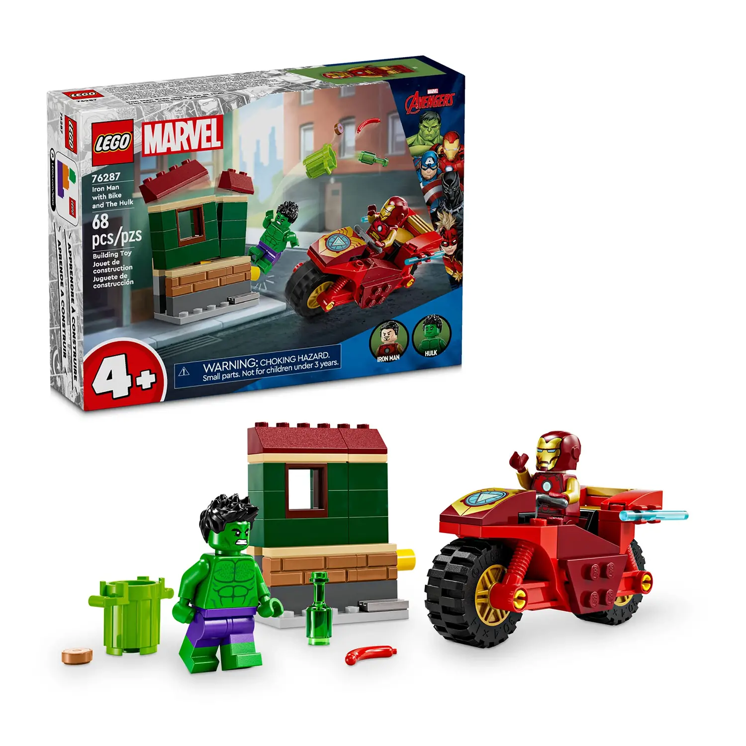Questo set include la motocicletta costruibile push-along di Iron Man e una casa costruibile con funzione di crollo. I bambini possono attivare il meccanismo per far crollare l’edificio e ricostruirlo, simulando le esplosioni di rabbia di Hulk. Ideale per sviluppare la creatività e l’immaginazione.