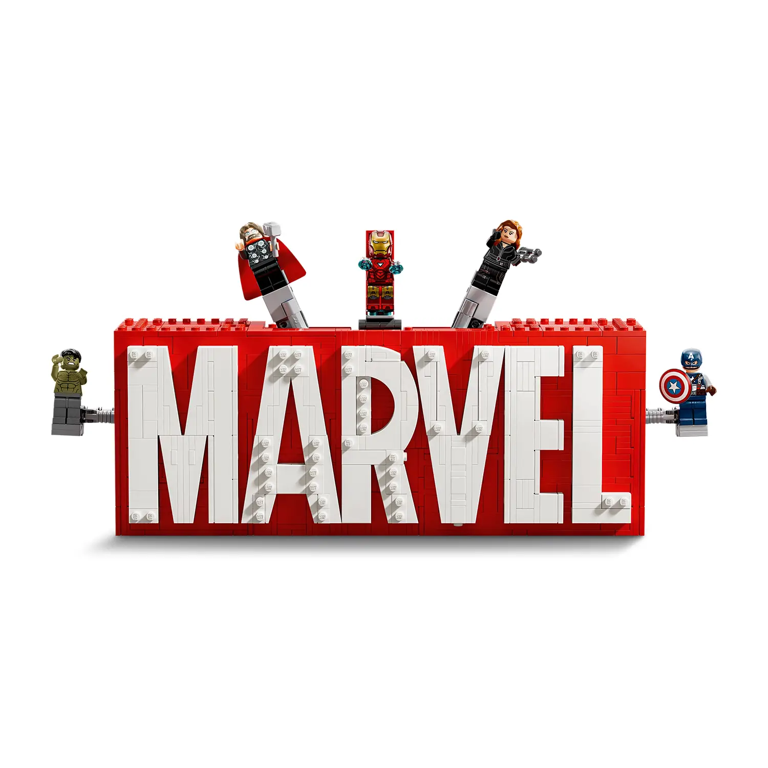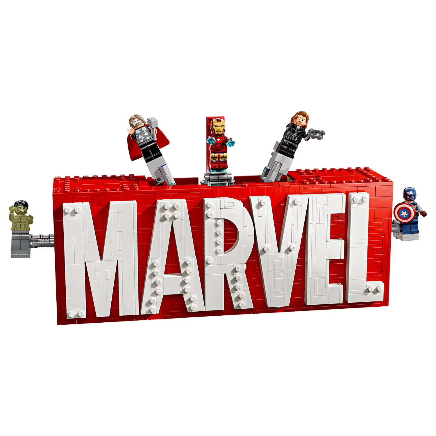 Dettagli del Logo Marvel Costruibile Realizzato con vivaci mattoncini rossi e bianchi, il logo MARVEL è un modello da collezione unico. Tre pulsanti sulla parte superiore attivano un’azione dinamica, facendo emergere le minifigure degli Avengers.