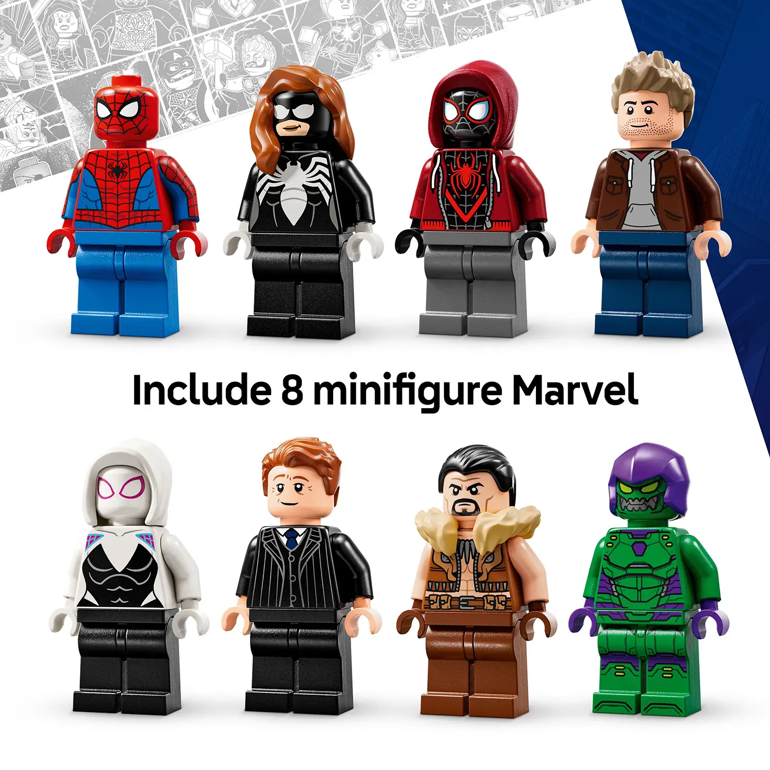 - ✅ Include 8 minifigure Marvel: Spider-Man, Spider-Woman, Miles Morales, Eddie Brock, Ghost-Spider, Norman Osborn, Umarak, Green Goblin