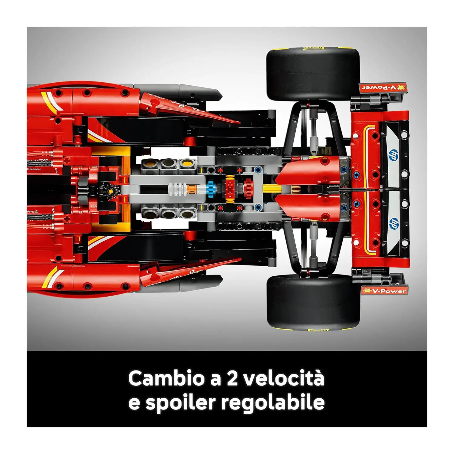 Motore E Cambio Dettagliati Rimuovi la cover del motore per esplorare il motore V6 con MGU-H rotante e il cambio a 2 velocità, dettagli che rendono questo modellino LEGO Technic una riproduzione fedele della monoposto Ferrari.