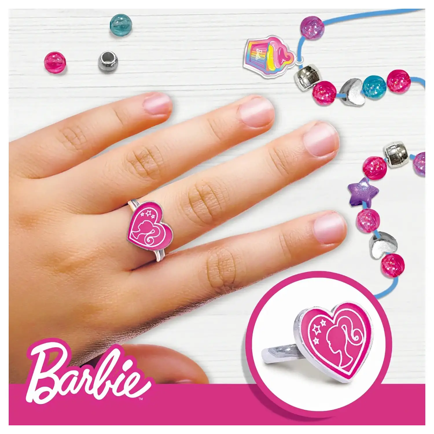 Charms personalizzati e anello Barbie Il kit include 4 charms unici e un anello Barbie esclusivo, per decorare i propri gioielli con simboli iconici. Ogni dettaglio riflette il mondo fashion e sognante di Barbie.