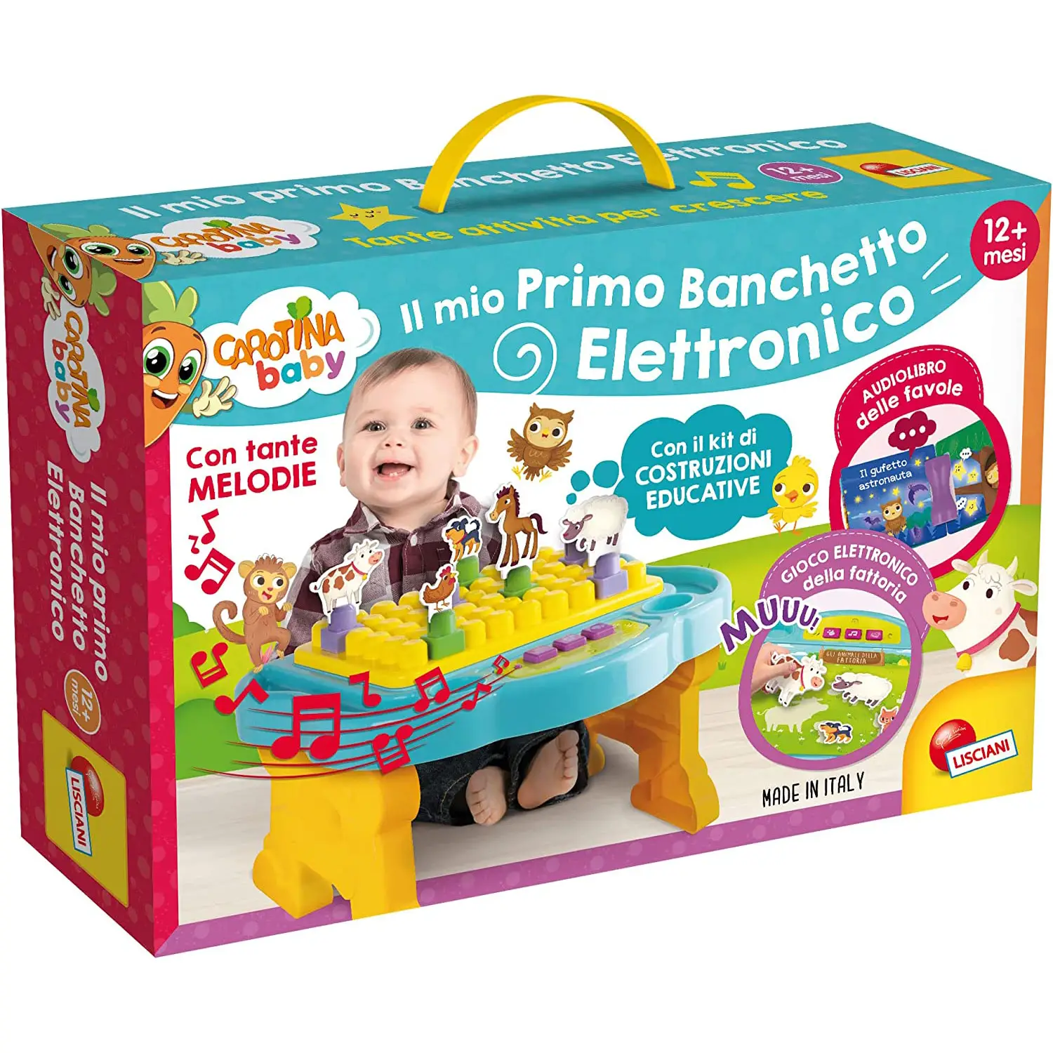 Il Carotina Baby Banchetto Elettronico offre storie, filastrocche e giochi di costruzione. Stimola manualità e concentrazione nei bambini.