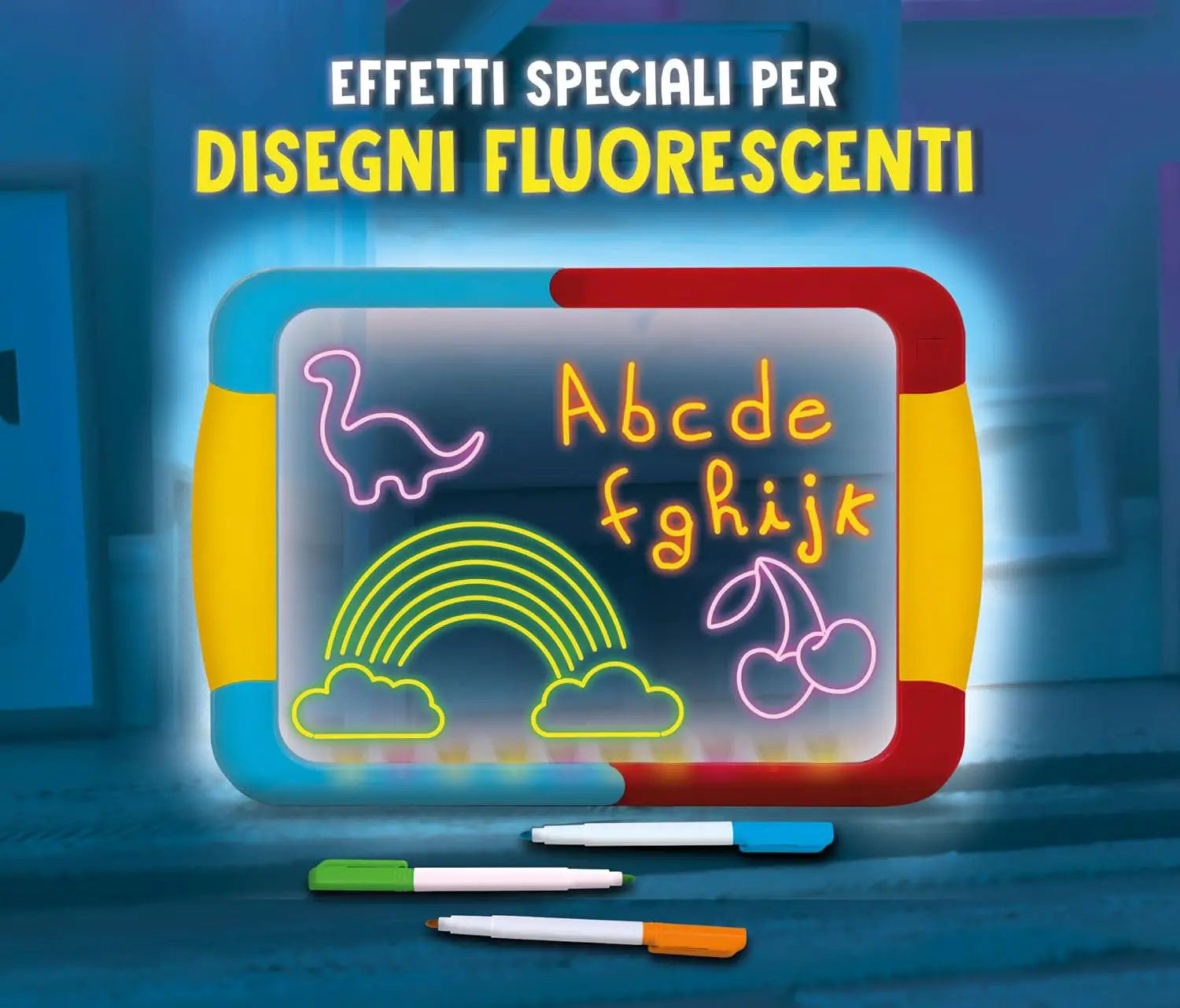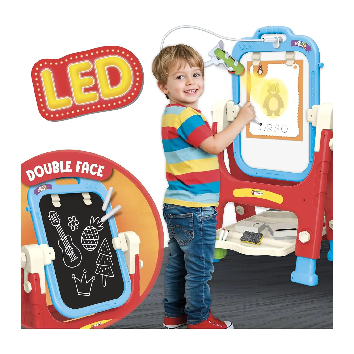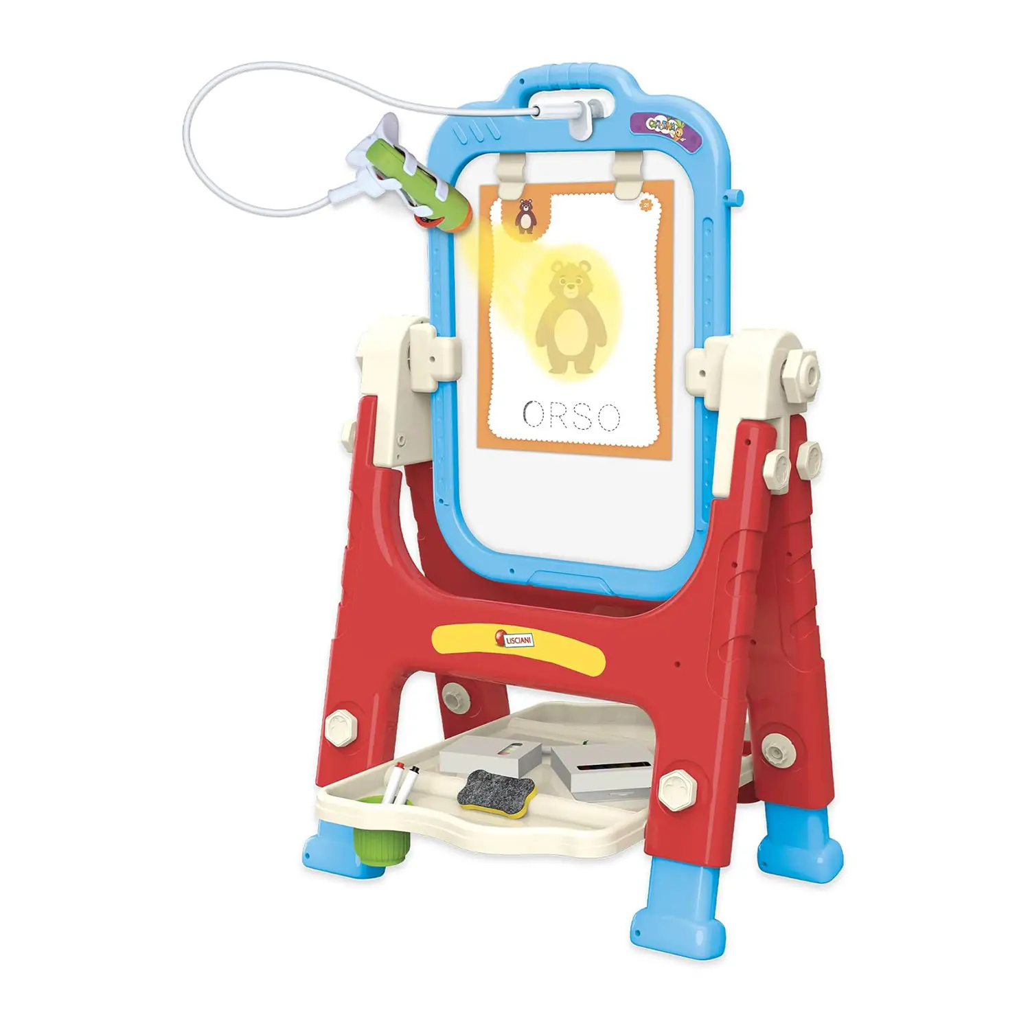 Lavagna educativa Carotina con proiettore LED La Carotina Lavagna Proiettore Led è una lavagna da terra interattiva che aiuta i bambini a imparare a scrivere e disegnare con una guida luminosa coinvolgente, pensata per la fascia prescolare.