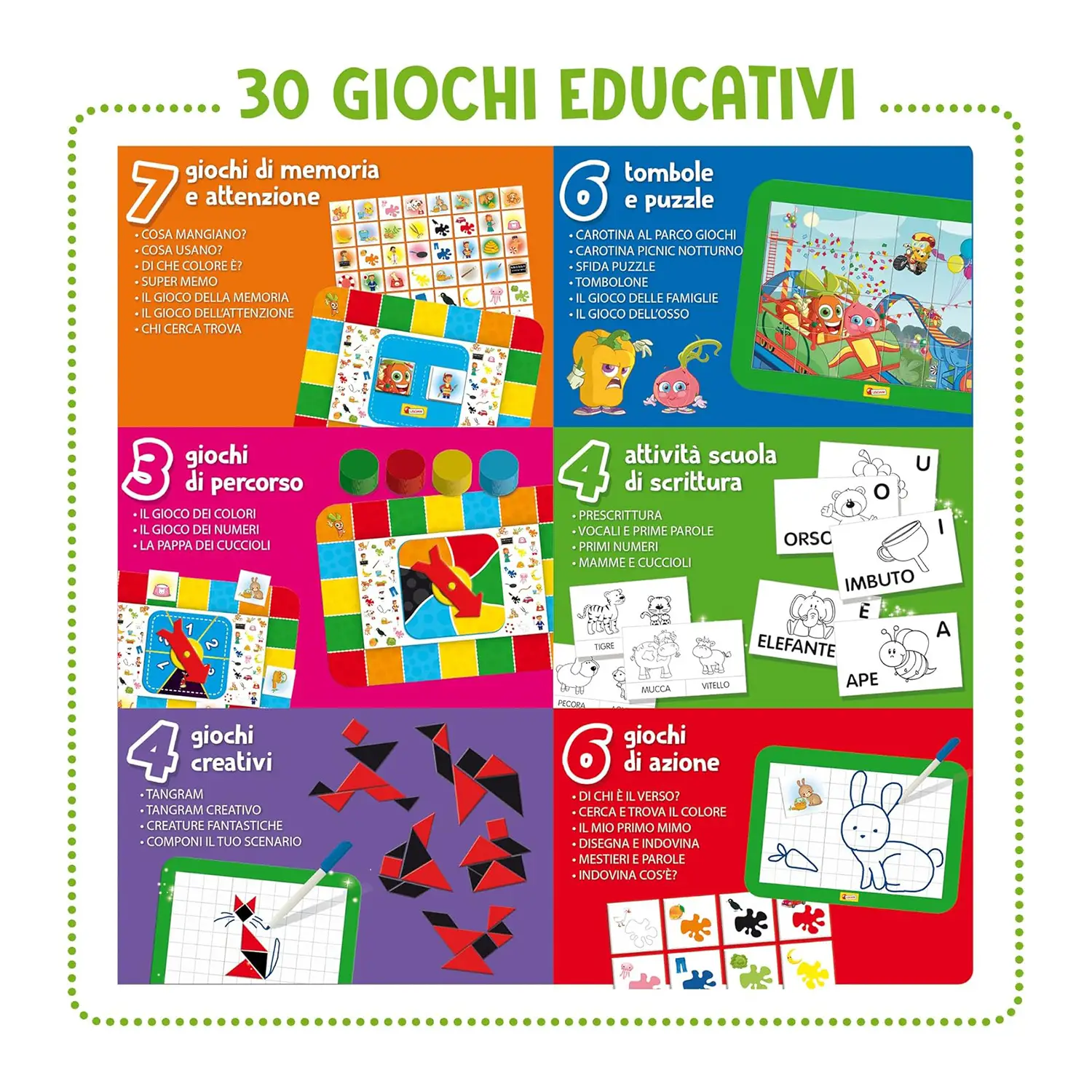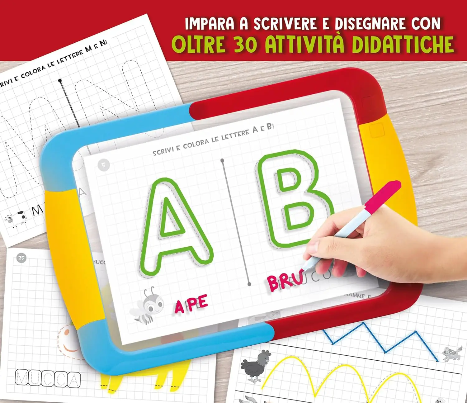 Set completo di accessori inclusi Nella confezione trovi pennarelli, gessetti, cancellino, porta penne, schede attività e istruzioni: tutto l’occorrente per iniziare subito senza acquisti aggiuntivi.