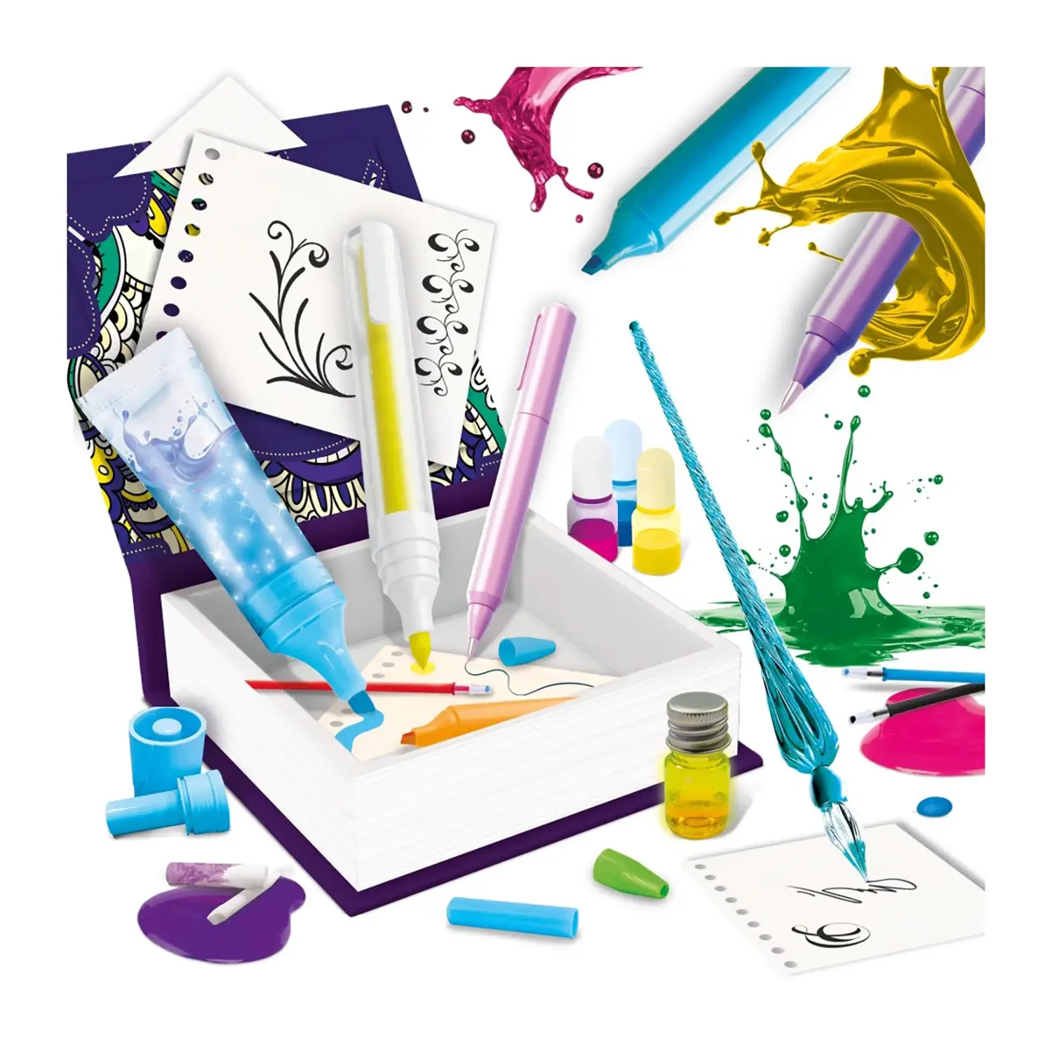 Inchiostri colorati, glitterati e profumati Il kit contiene una varietà di inchiostri colorati, brillanti, glitterati e profumati, da mescolare e sperimentare, stimolando fantasia, creatività e abilità manuale.