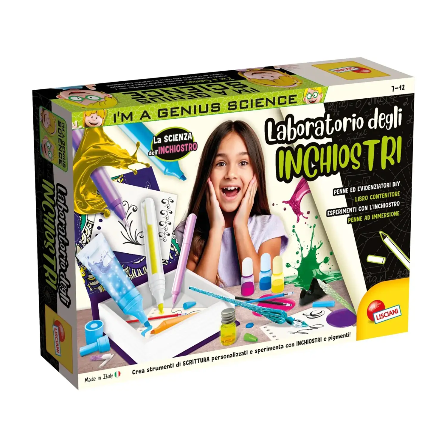 Crea penne e inchiostri personalizzati I’m A Genius – Laboratorio di Inchiostri è un kit creativo e scientifico che permette ai bambini di realizzare strumenti di scrittura unici, sperimentando con pigmenti, colori e profumazioni.