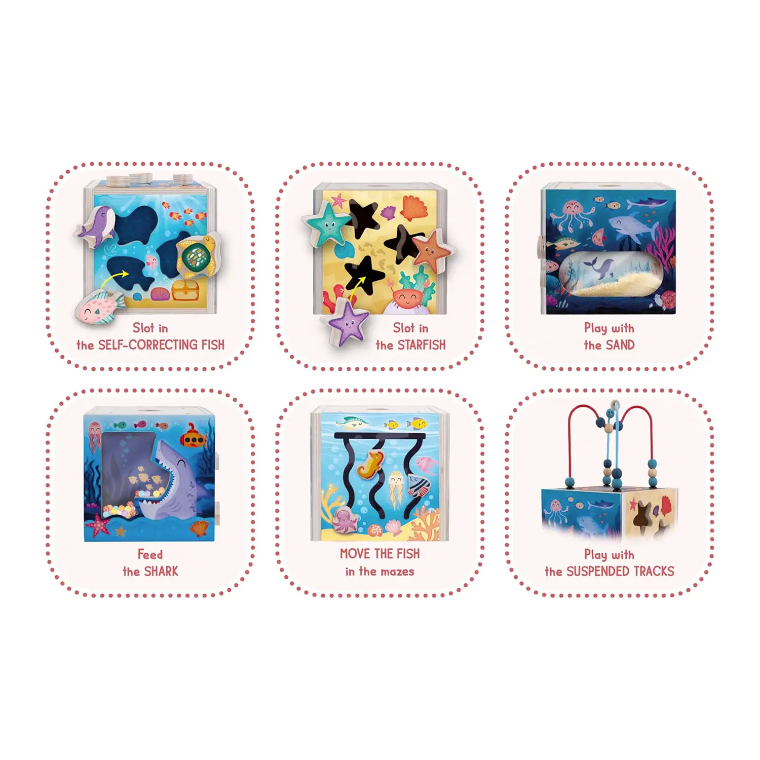 Cubo educativo multisensoriale Un gioco Montessori in legno che offre tante attività ispirate al mondo marino per stimolare curiosità e apprendimento.