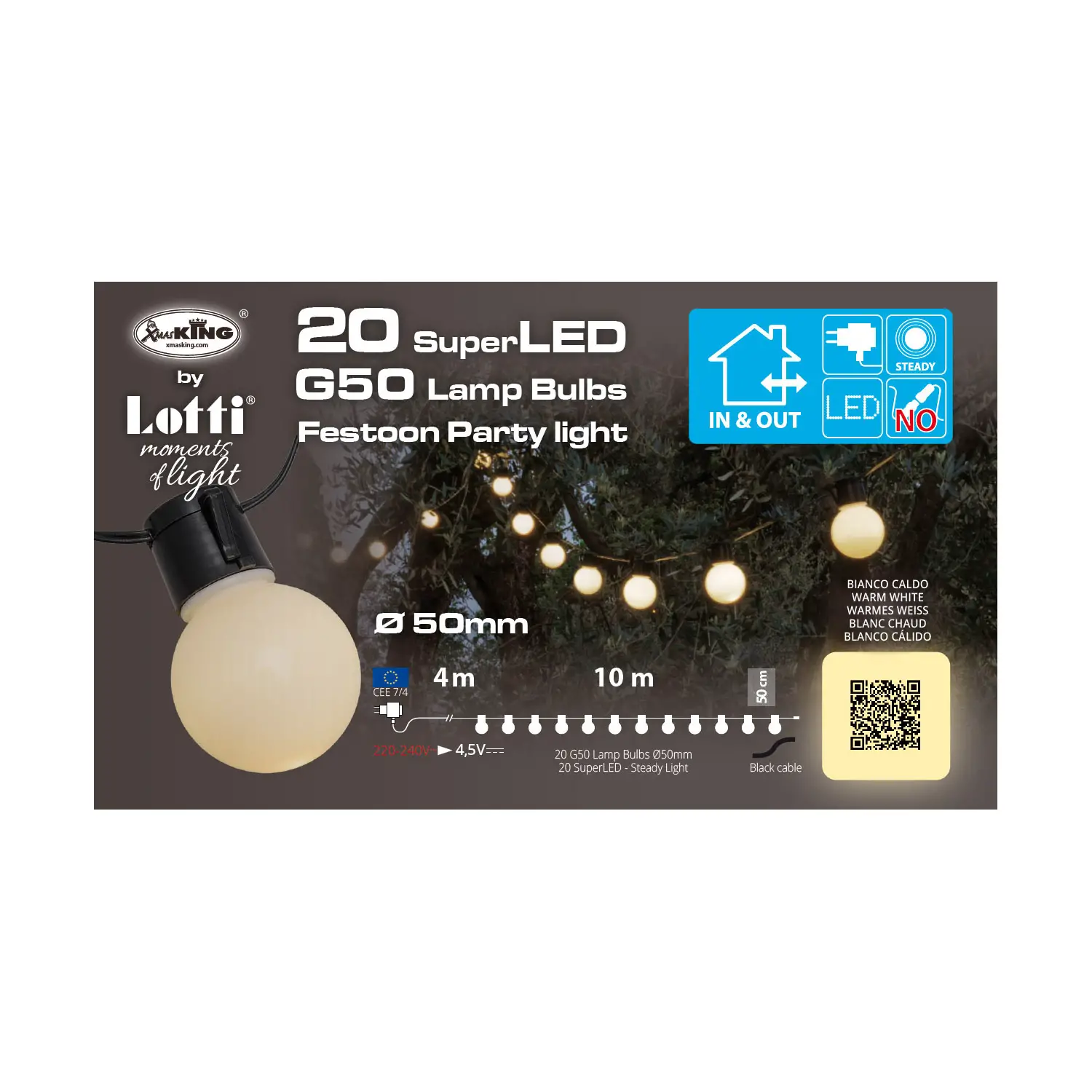 - ✅ Catena luminosa con 20 lampadine G50 SuperLED a luce bianco caldo, diametro 50 mm, altezza 60 mm.