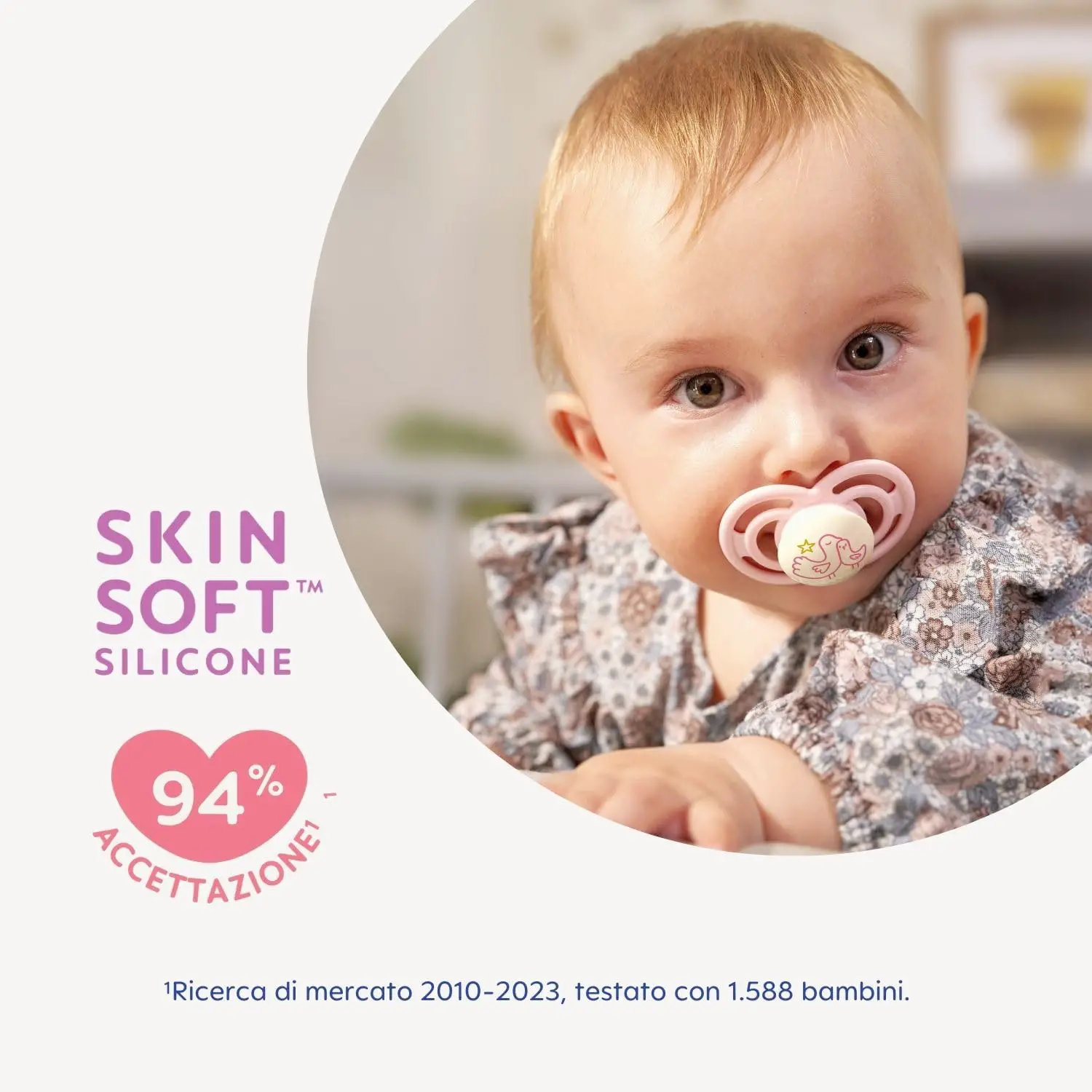 Simile al seno materno Grazie al silicone SkinSoft, accettato dal 94% dei neonati, il ciuccio offre una sensazione naturale e confortevole. Facilita la transizione dall’allattamento al seno all’uso del succhietto, riducendo il rifiuto.