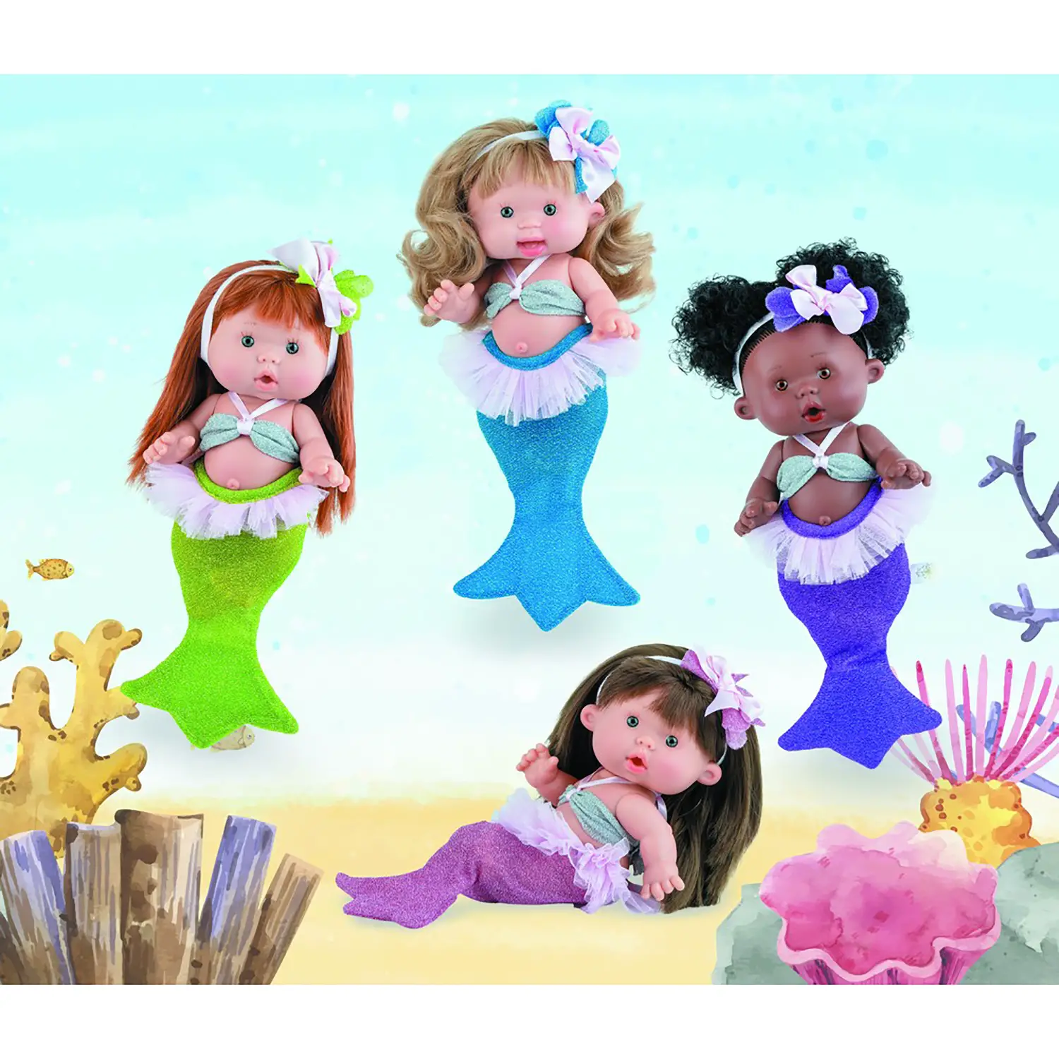 La Bambola Nenote Principessa Del Mare 910 Assortita cattura i cuori con i suoi dolci sorrisi e gli abiti colorati ispirati al mare. Ogni bambola è unica, con diversi colori di coda e accessori, rendendo ogni esemplare speciale.