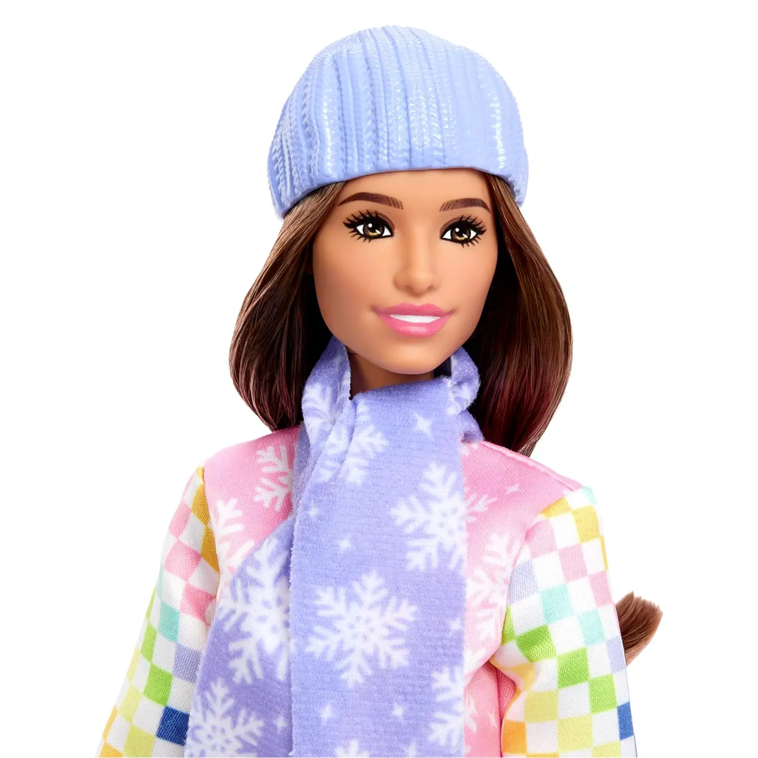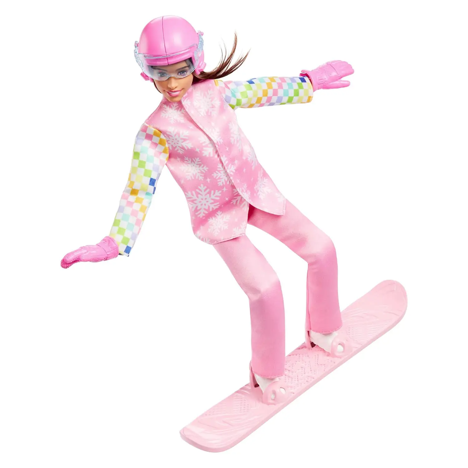 Look Invernale Super Fashion Barbie indossa una giacca rosa con fiocchi di neve e maniche a scacchi, pantaloni coordinati e stivali rosa perfetti per affrontare le piste con grinta e stile.
