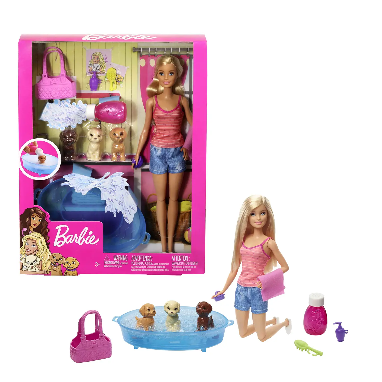 Bagnetto per cuccioli? Barbie è pronta! Con il playset Barbie Toeletta con 3 cuccioli, il divertimento prende vita: i bambini potranno prendersi cura degli adorabili amici a quattro zampe insieme alla loro fashion doll preferita.