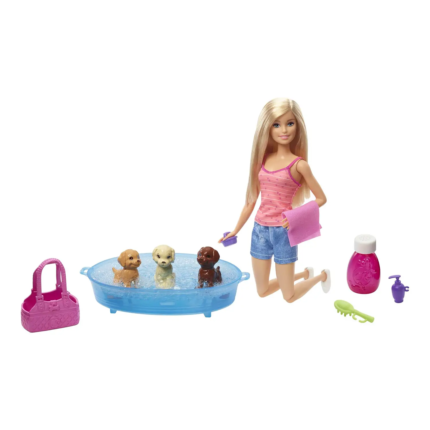 Cura, gioco e avventura Dopo il bagno, i cuccioli possono essere asciugati con l’asciugamano incluso e messi nella borsa da trasporto, pronti per nuove avventure con Barbie.