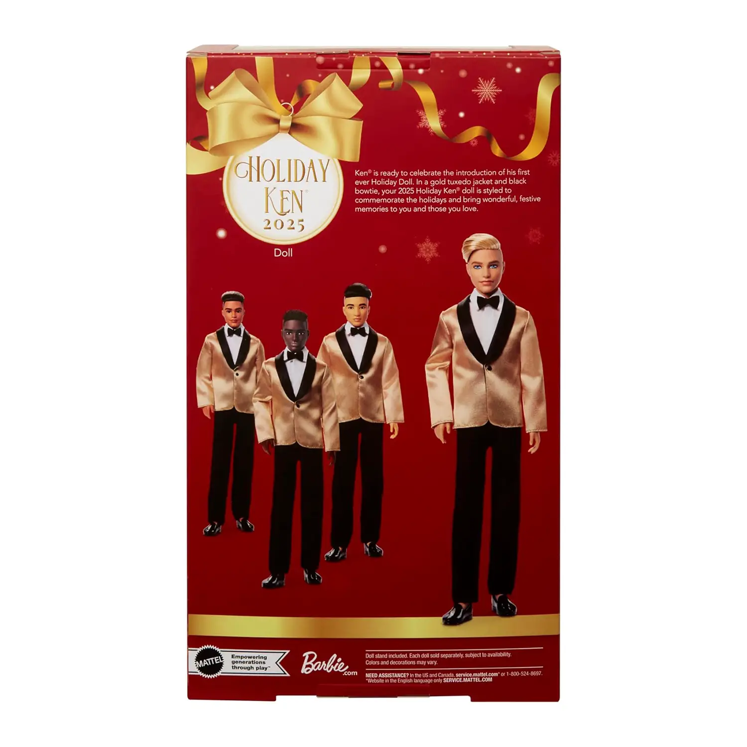 Giusto in tempo per le festività natalizie, vi presentiamo la bambola Ken delle Feste 2025! Il lussuoso completo di Ken risplende attraverso la confezione! L’abito si distingue per la giacca in raso dorato, la camicia con colletto bianco, i pantaloni e le scarpe nere, mentre il papillon nero aggiunge ulteriore eleganza natalizia! Il look è completato dai suoi voluminosi capelli biondo platino con radici! La splendida confezione rende la bambola Ken delle Feste 2025 perfetta per le festività: possa portare momenti di pace e gioia nelle case di tutto il mondo!