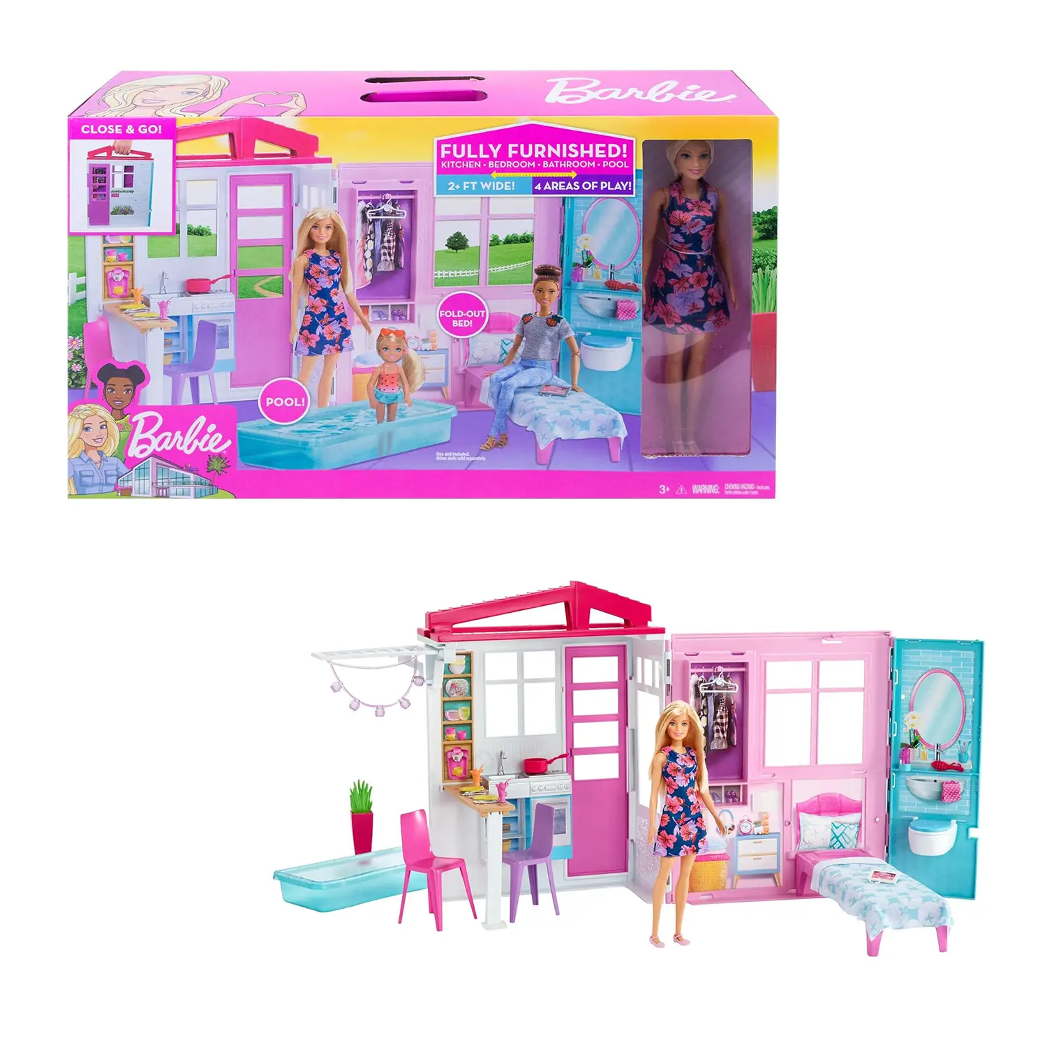 - ✅ Casa Barbie compatta che si apre in uno spazio gioco di oltre 60 cm con cucina, camera, bagno, patio e piscina.