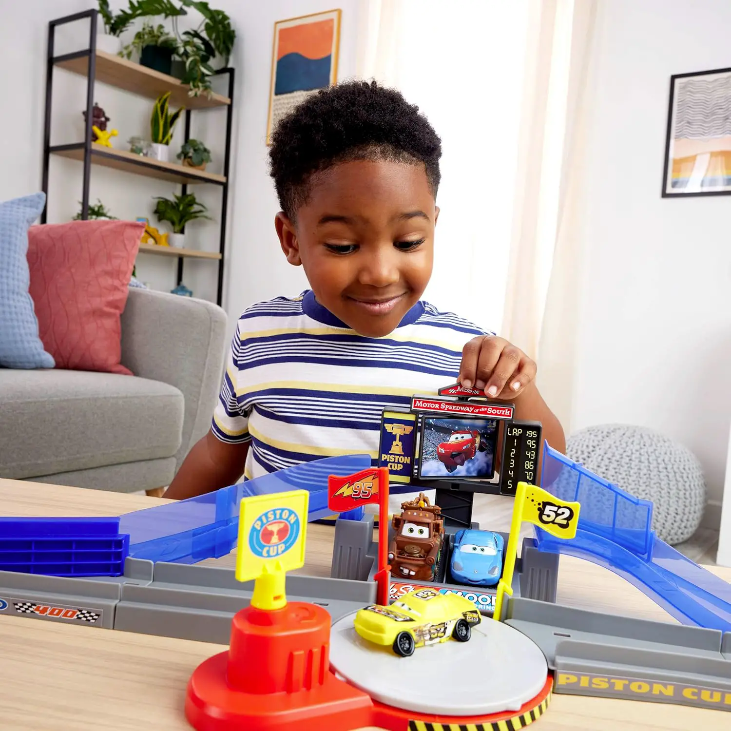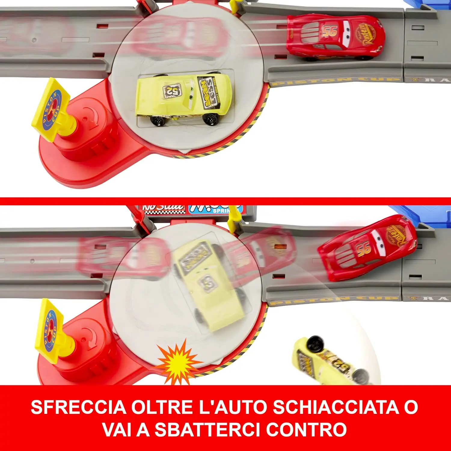 Zona di Scontro Interattiva Ruotando la bandiera gialla si attiva la zona di impatto: i bambini devono lanciare Saetta McQueen al momento giusto per superare l’ostacolo o schiantarsi contro l’auto distrutta.