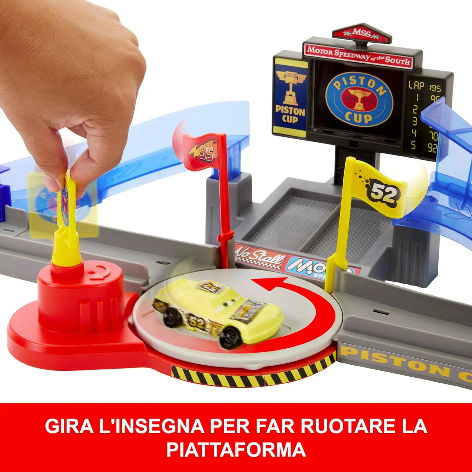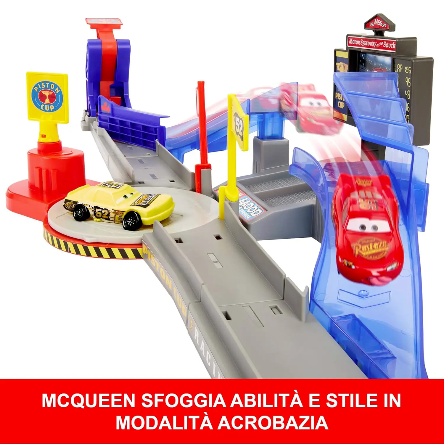 Acrobazie e Dettagli Divertenti Il grande schermo rotante mostra Saetta McQueen che salta facendo la linguaccia, rendendo l’azione ancora più coinvolgente per i piccoli fan di Cars.