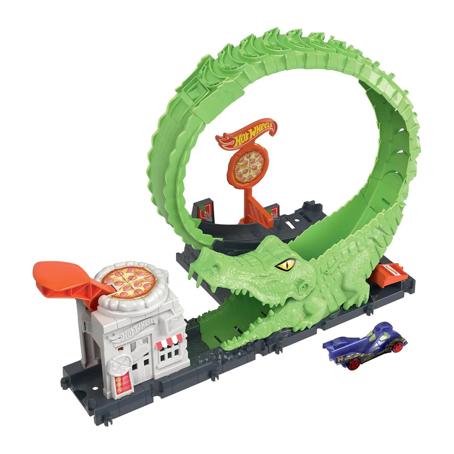 Sfida il Coccodrillo e Salva la Pizzeria! Un feroce coccodrillo ha attaccato la pizzeria Hot Wheels! Lancia la tua macchinina nella sua bocca e sfuggi attraverso la coda regolabile, trasformabile in un loop o una spirale per acrobazie mozzafiato.