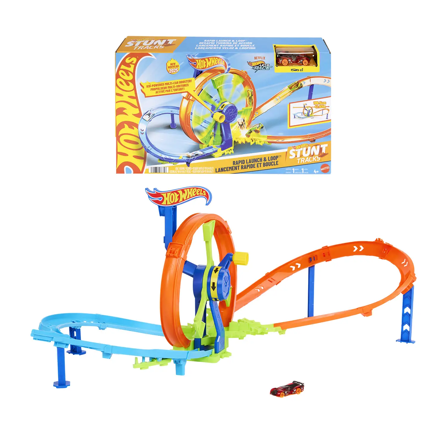 Loop a propulsione con manovella Il playset Hot Wheels Pista Loop Rotante include un acceleratore manuale che fa sfrecciare le macchinine attraverso un loop verticale, offrendo ore di azione continua e senza batterie.