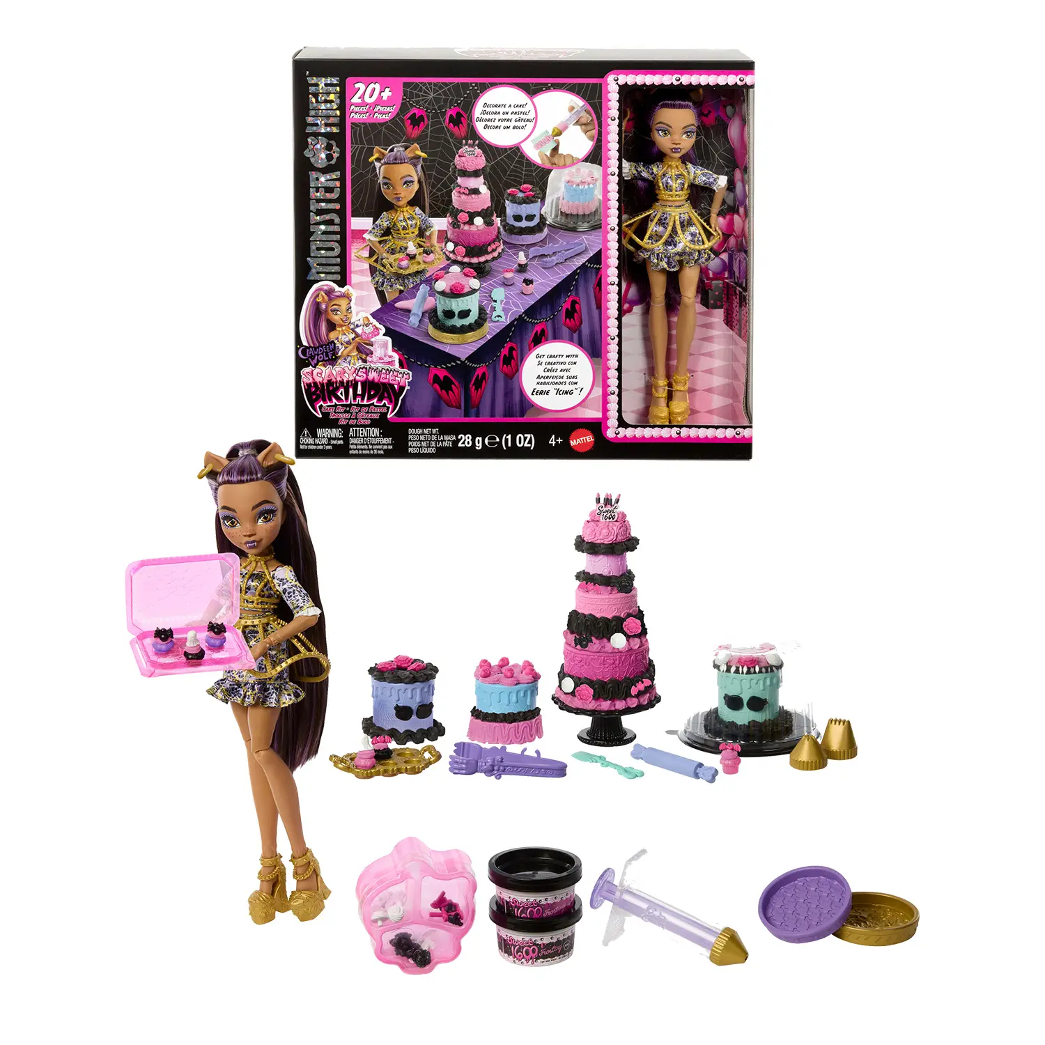 Bambola Clawdeen Wolf inclusa Il playset include la bambola Clawdeen Wolf, pronta per il compleanno di Draculaura. Clawdeen indossa un elegante abito viola e dorato con gonna a gabbia e scarpe da festa, perfetto per una celebrazione mostruosamente glamour.