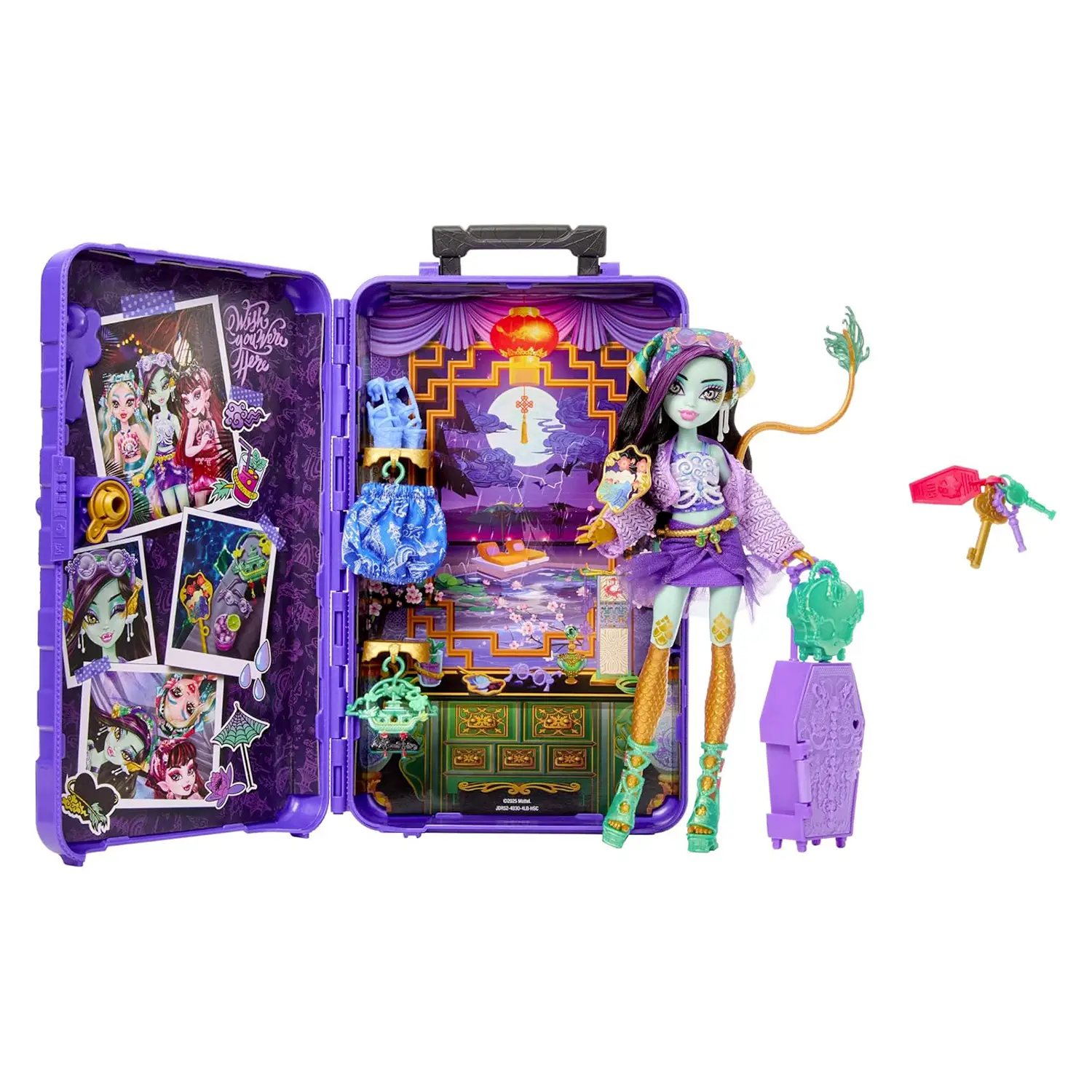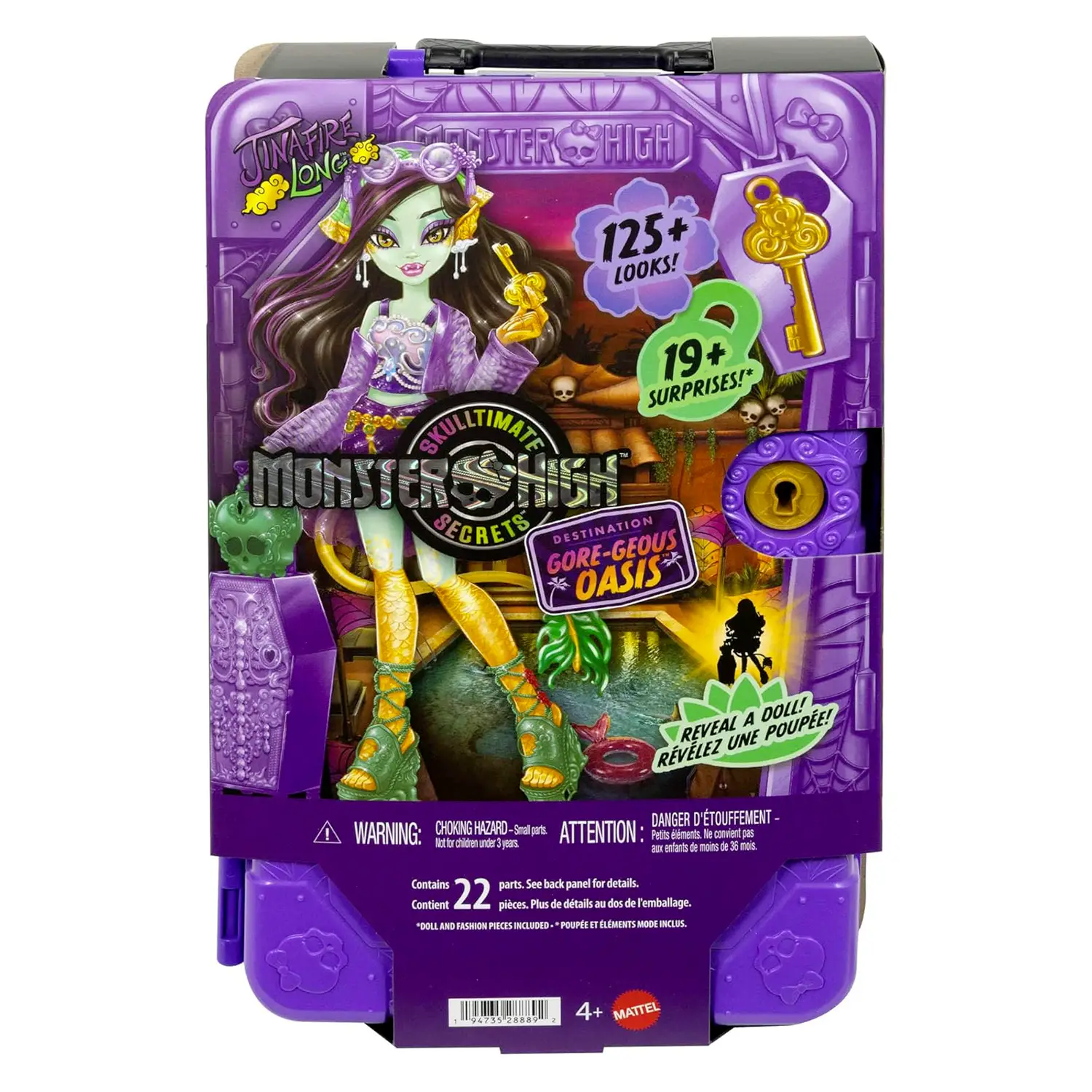 Destinazione Oasi di Gore-geous Monster High Segreti da Brivido si aggiorna con la versione Jinafire Long – Oasi di Gore-geous! Il set include la bambola, abiti da viaggio e accessori per una vacanza mostruosamente elegante.