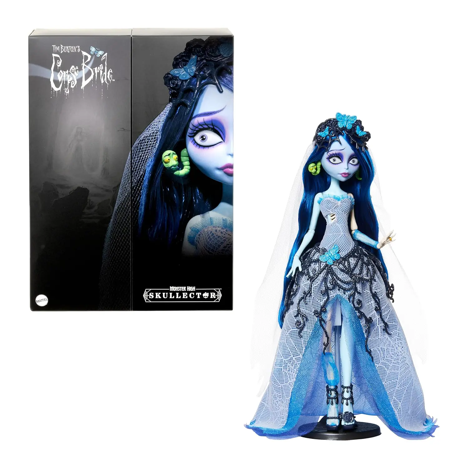 Debutto di Emily La Sposa Cadavere Emily La Sposa Cadavere fa il suo debutto con Monster High Skullector. Questa bambola unica è perfetta per chi ama il gotico e il mistero. Abito da Sposa Gotico Emily indossa un abito da sposa gotico mozzafiato. Realizzato in tessuto a tela di ragno trasparente, rivela un incantevole tulle blu. Dettagli Eterei e Unici Il velo trasparente con farfalle, Maggot sulle orecchie e l’anello dorato completano il look di Emily, rendendola unica. Scarpe e Confezione Spettrale Le scarpe con perline nere e dettagli unici sono racchiuse in una confezione affascinante, perfetta per collezionisti e fan del film.
