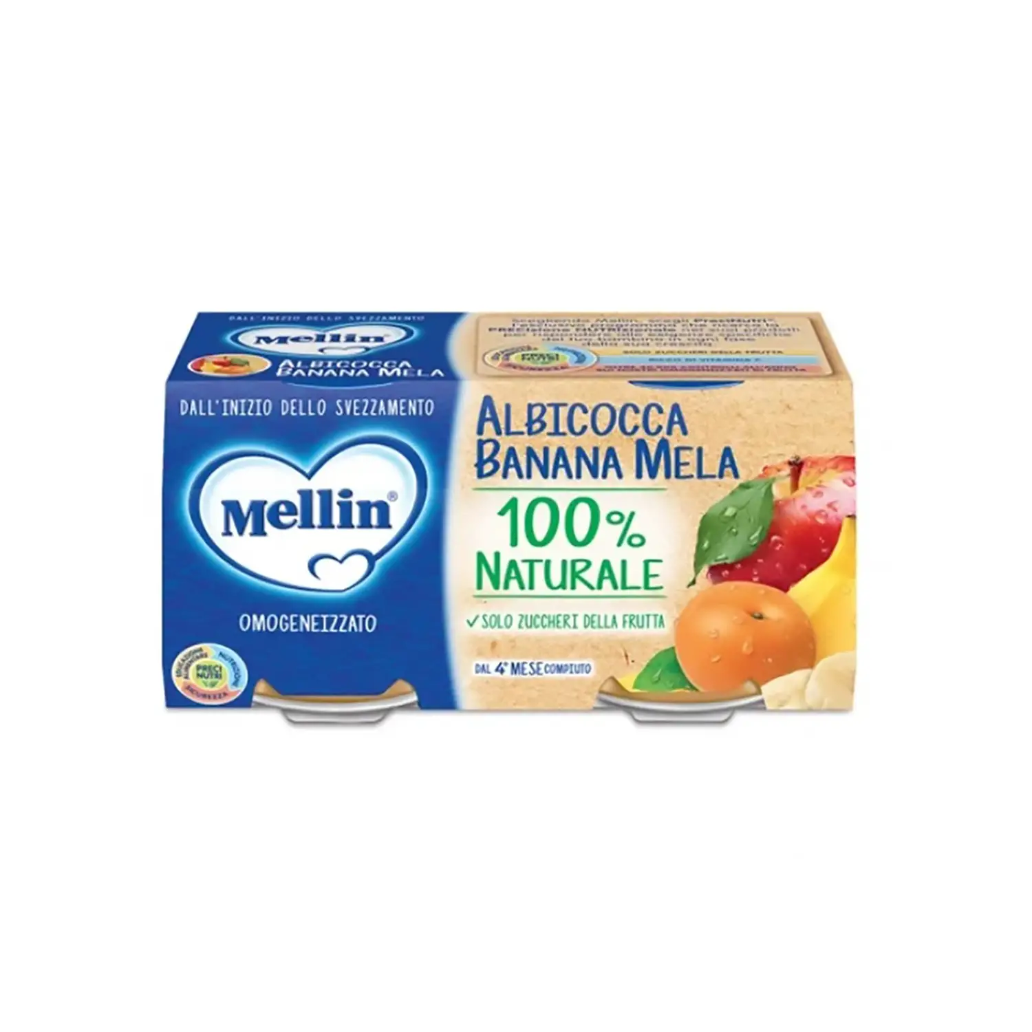 L’Omogeneizzato Albicocca Banana Mela Mellin: • Mantiene il buon sapore della frutta, salvaguardandone le proprietà nutrizionali grazie alla delicata omogeneizzazione • Contiene un’adeguata quantità di zucchero • Non contiene coloranti e conservanti, come per legge • Non contiene glutine e proteine del latte