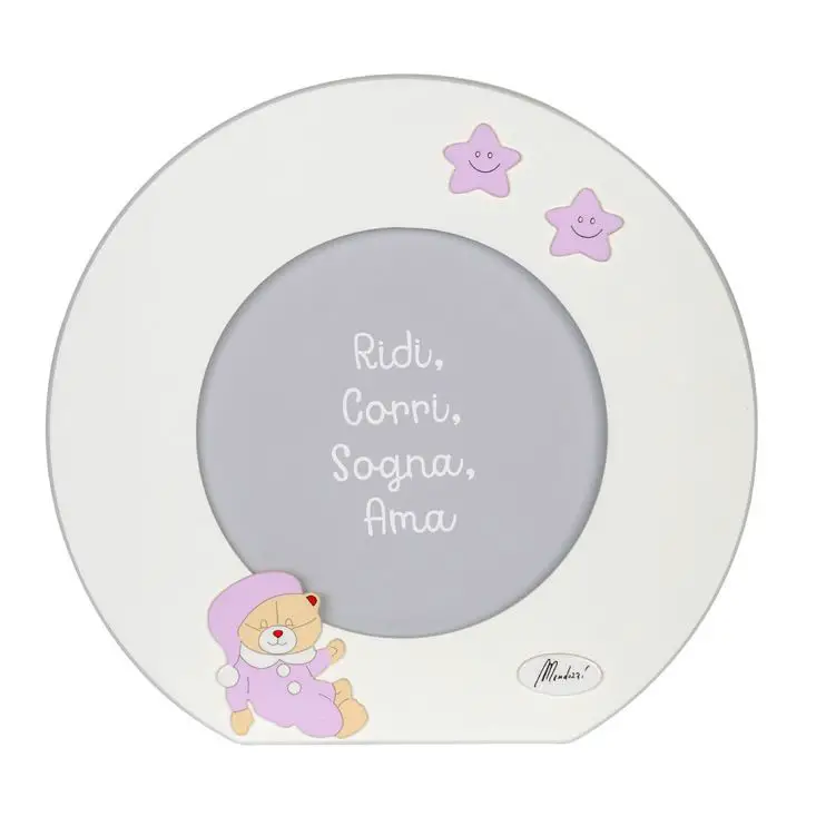 PORTA FOTO IN LEGNO BIANCO CON ORSO ROSA TONDO DIAM.25.5