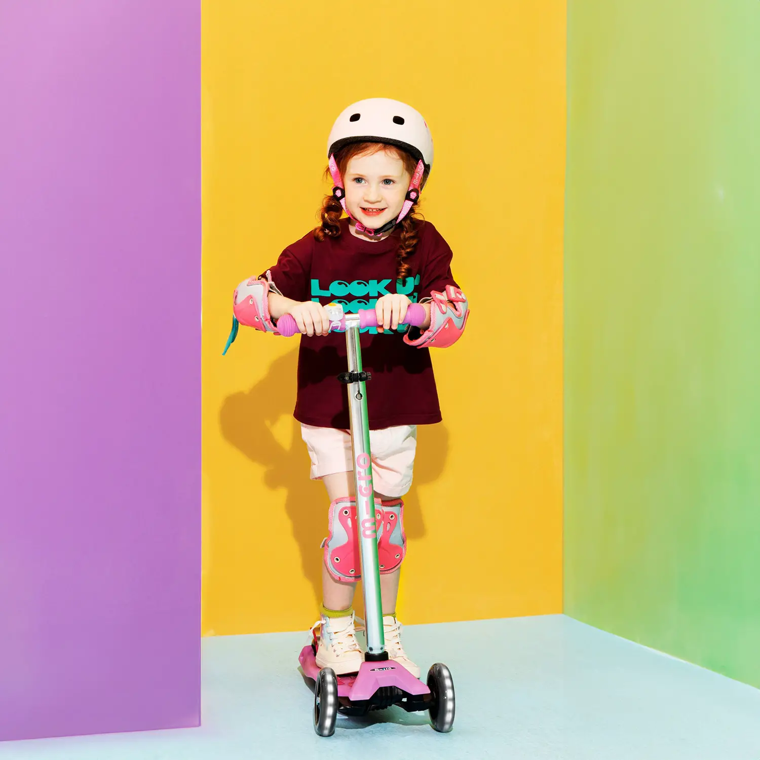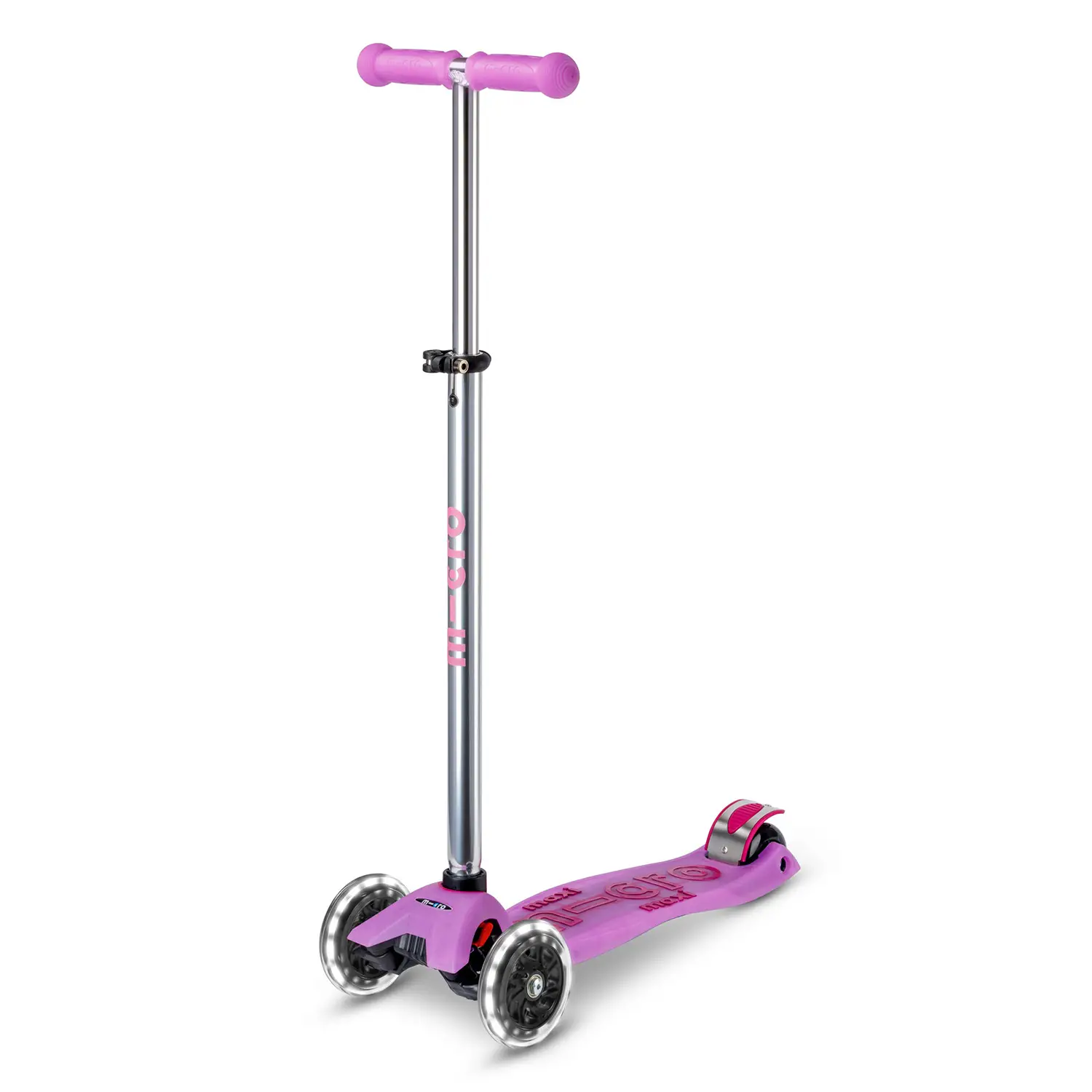 Monopattino a tre ruote sicuro il Maxi Micro Deluxe LED Glow Viola garantisce stabilità grazie al sistema a 3 ruote e sterzo a inclinazione del corpo, ideale per bambini dai 5 ai 12 anni.