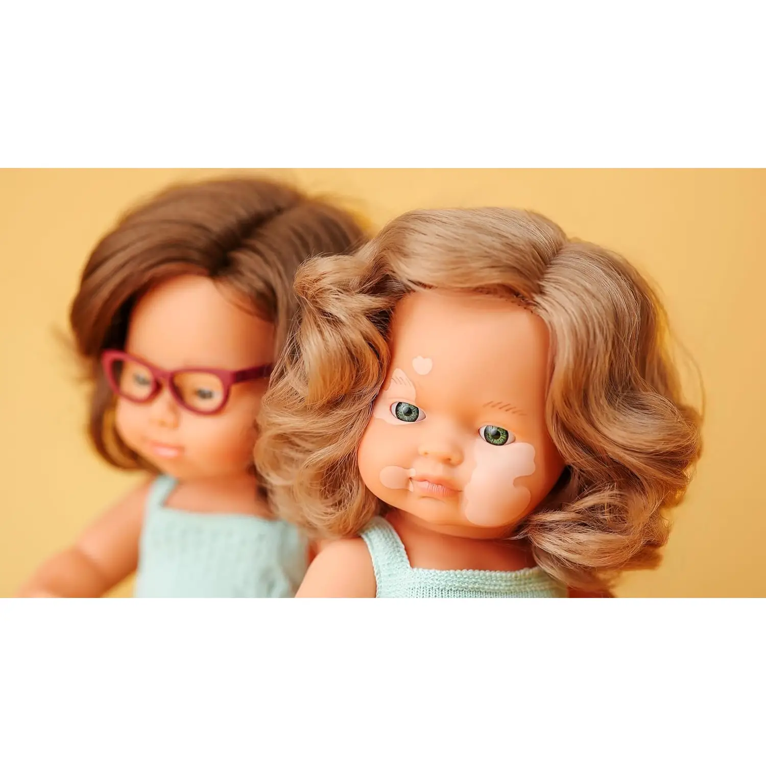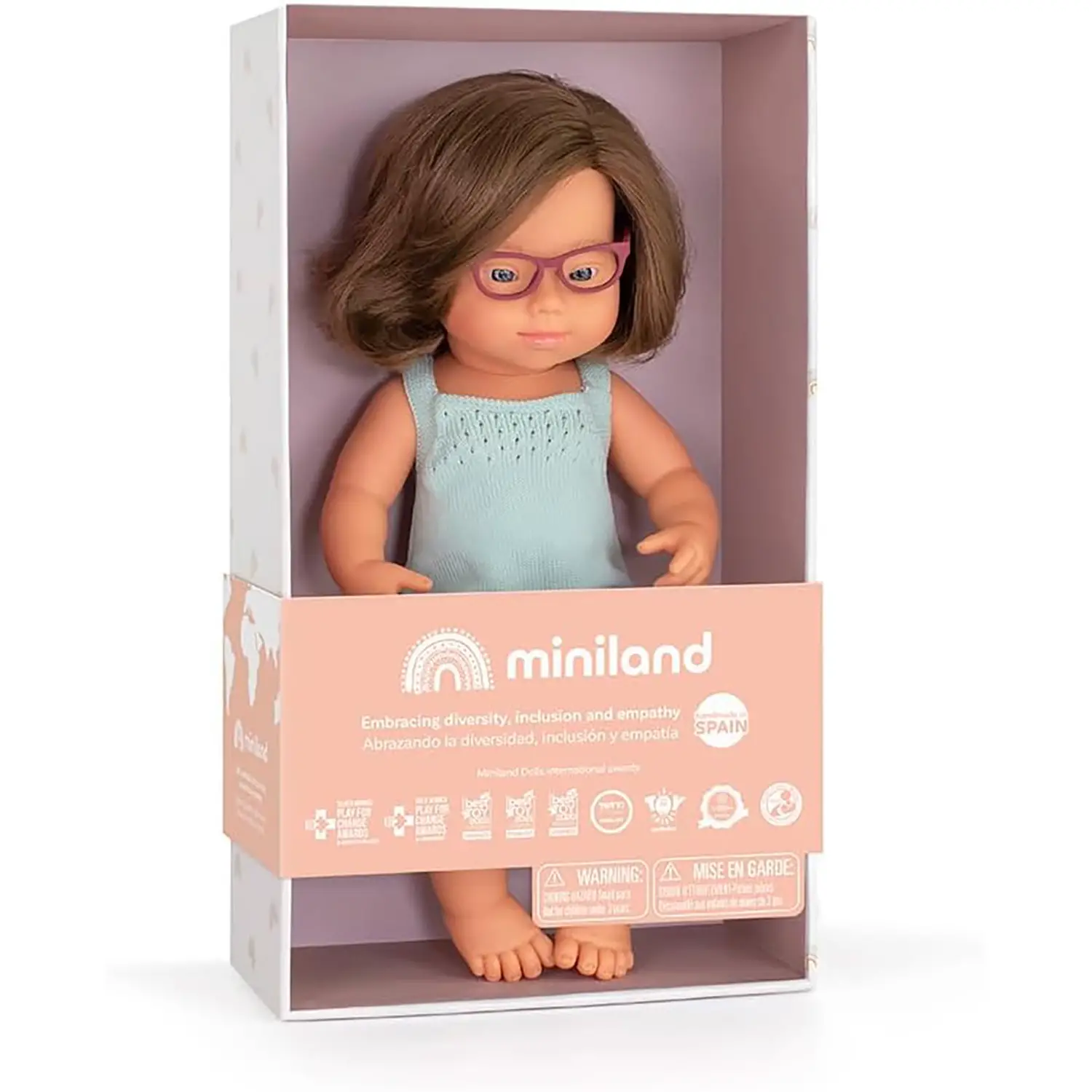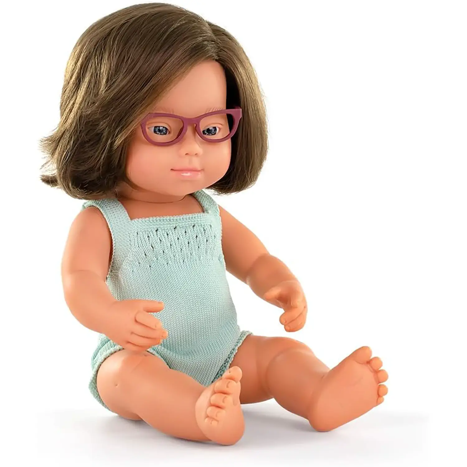 Diversità e inclusione: La bambola è di etnia caucasica, con sindrome di down e indossa occhiali da vista, promuovendo la consapevolezza sulla diversità e l’accettazione delle differenze.