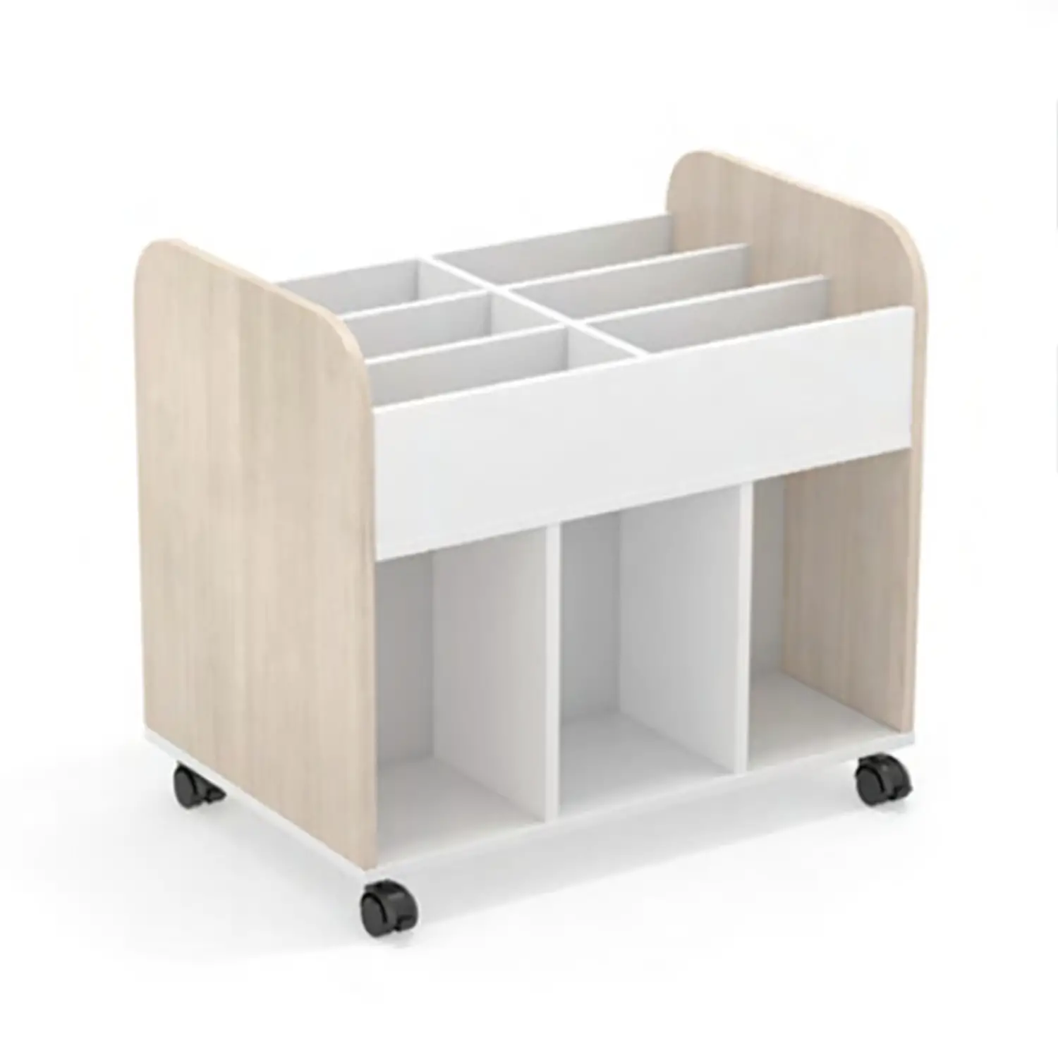 Carrello in conglomerato ligneo laminato finitura bianco opaco antiriflesso e antigraffio. Attrezzato con numerosi vani e scomparti per riporre un’ampia varietà di libri, colori, sussidi vari e accessori.Dimensioni: ingombro cm 56x84x77hColore: bianco/naturale