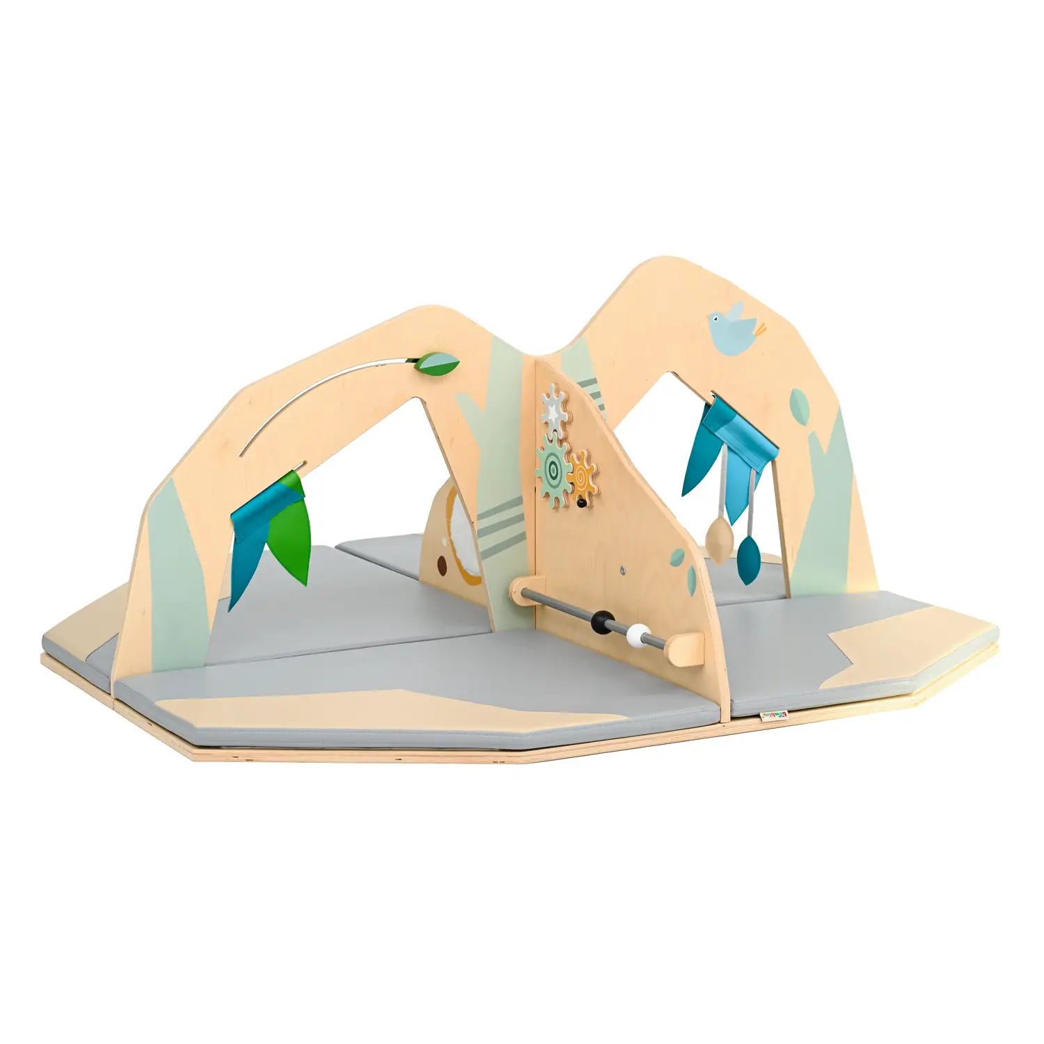 L’isola offre diverse attività per i bambini: - Specchio: permette ai bambini di esplorare la propria immagine in sicurezza. - Labirinti mobili: stimolano la coordinazione occhio-mano e le capacità di problem solving. - Ingranaggi: aiutano i bambini a comprendere i concetti di causa ed effetto. - Elementi in peluche: offrono una morbida superficie tattile. - Materassini: garantiscono un atterraggio sicuro in caso di cadute.