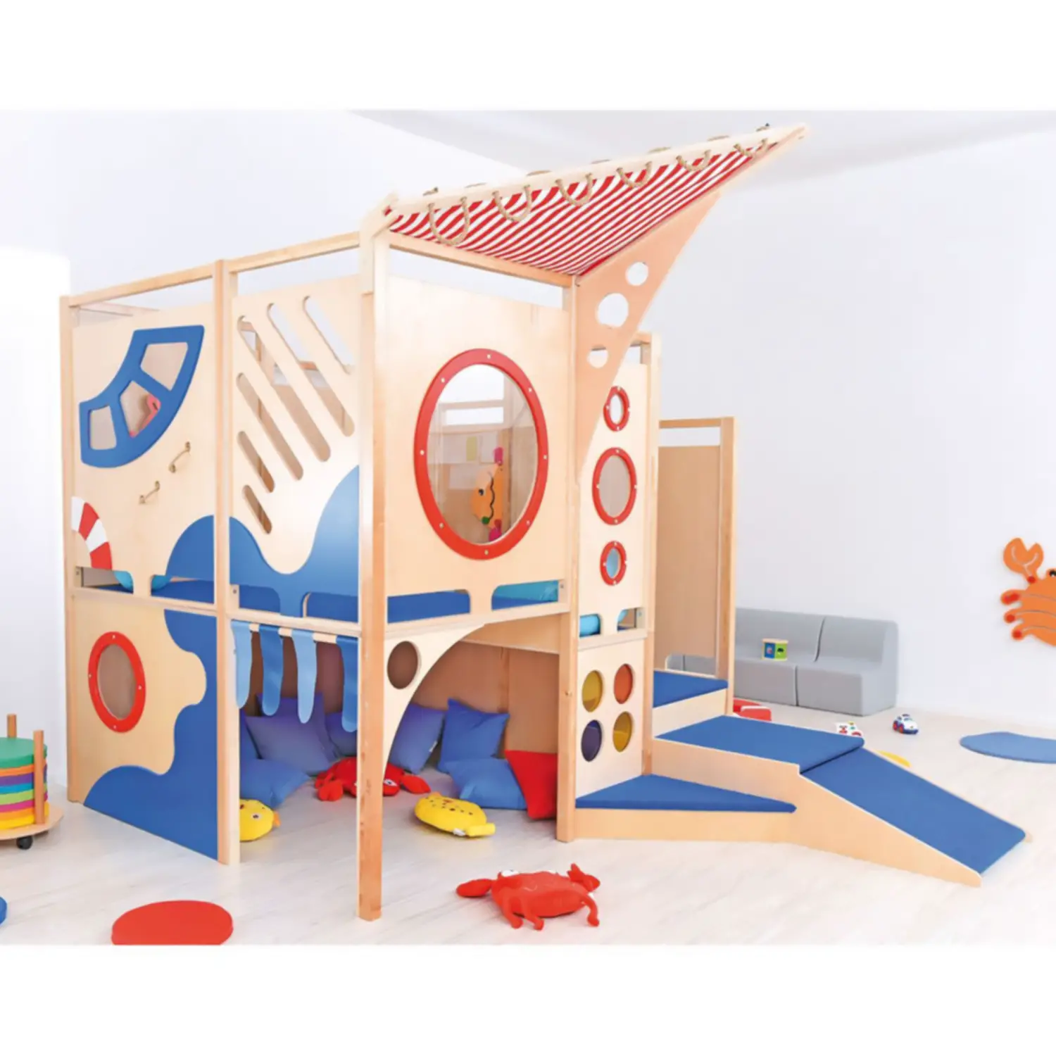 Completo angolo gioco in conglomerato ligneo laminato e multistrato verniciato al naturale con finitura trasparente atossica, angoli e bordi arrotondati.