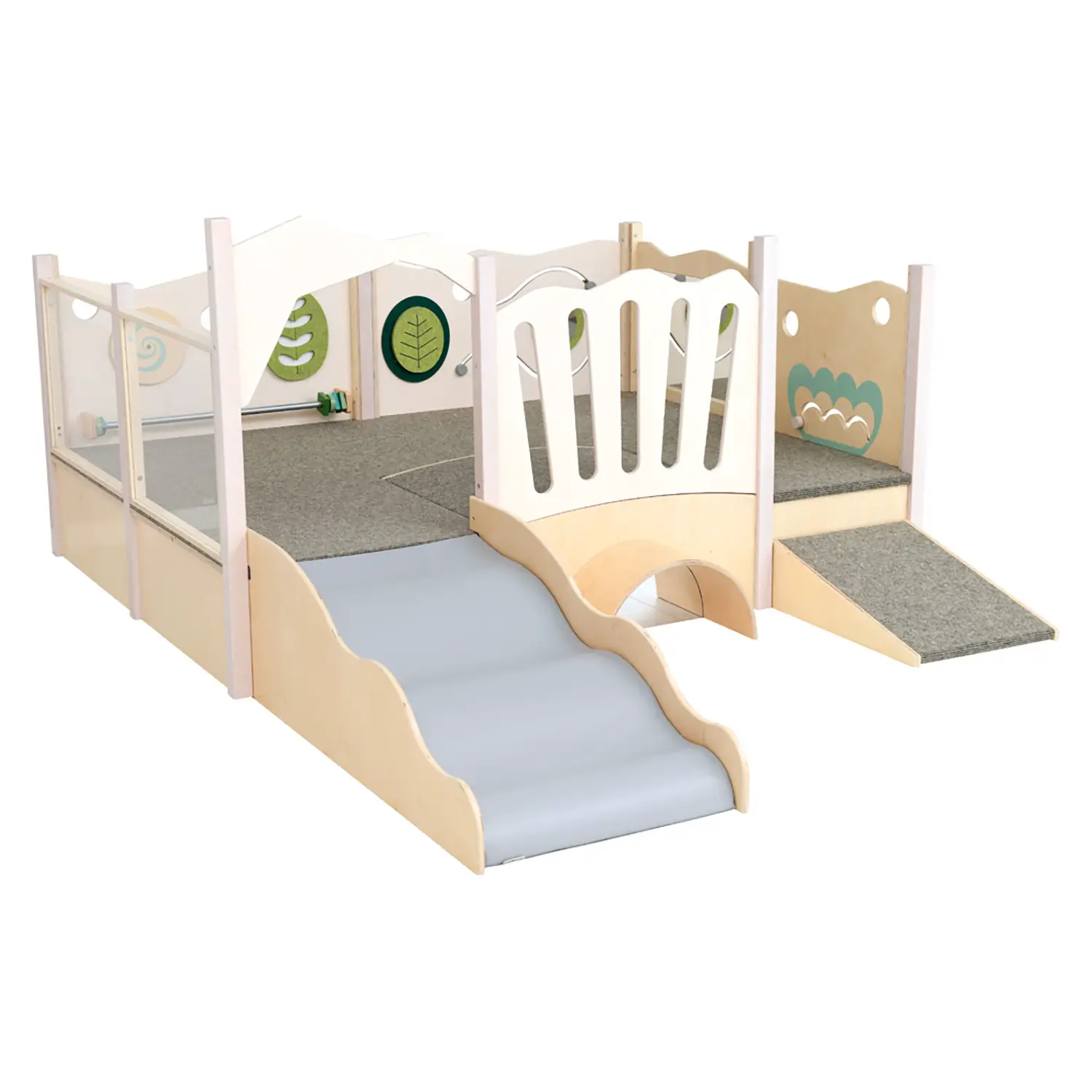 Materiali di Alta Qualità: La struttura principale è realizzata in legno multistrato verniciato, con una finitura trasparente atossica. I bordi sono arrotondati per garantire la sicurezza dei bambini. Inoltre, le superfici di camminamento sono rivestite con moquette antiscivolo naturale Tretford, che offre ulteriori misure di sicurezza.