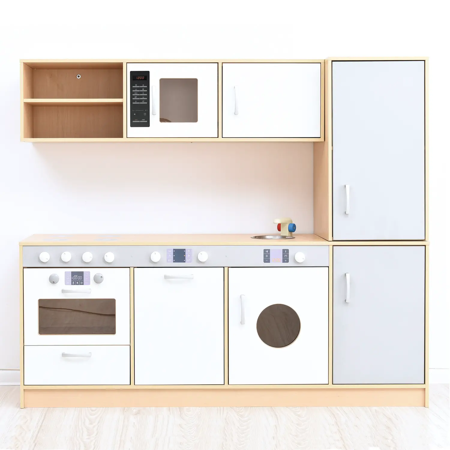 Una serie di armadi che imitano la cucina. Realizzato in cartone laminato con uno spessore di 14mm. Frontali realizzati in MDF di spessore. 14mm.