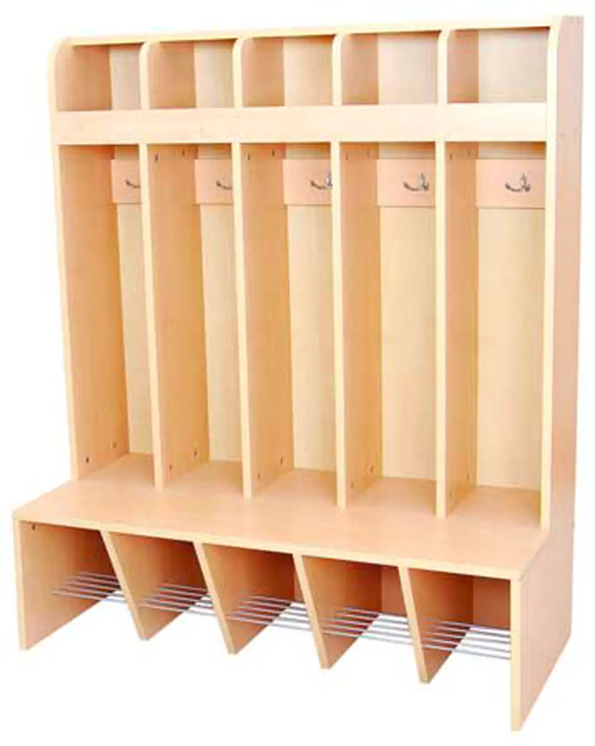 Lo spogliatoio GIODIARREDA in conglomerato ligneo nobilitato finitura betulla è ideale per scuole, asili nido e ambienti educativi, offrendo una soluzione pratica e ordinata per appendere vestiti, cappelli e organizzare le scarpe.